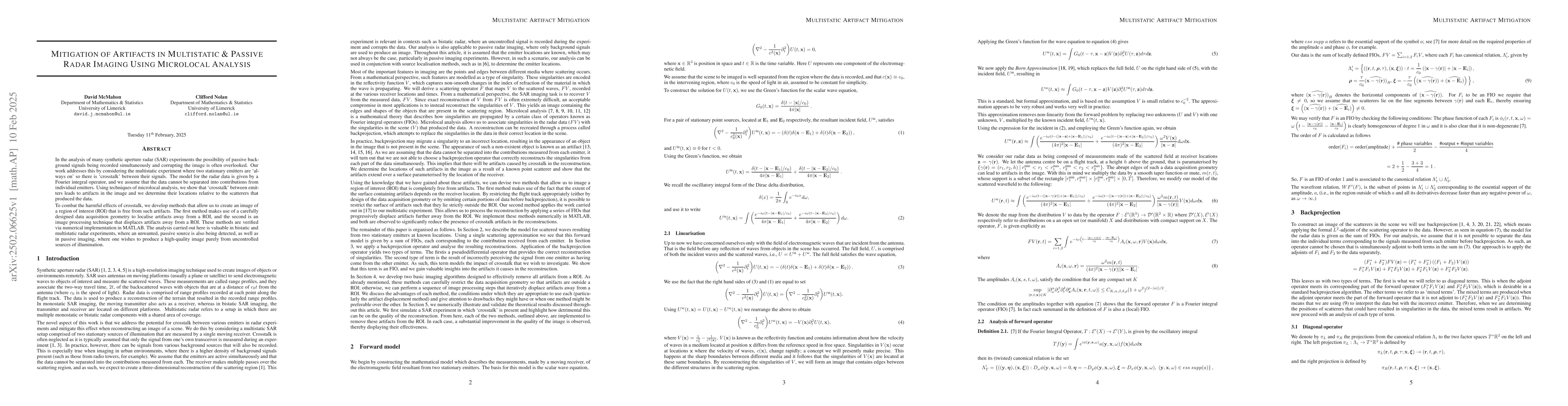 The paper presents microlocal analysis methods to identify and mitigate artifacts caused by crosstalk in multistatic radar imaging, providing both geometric and image processing solutions.