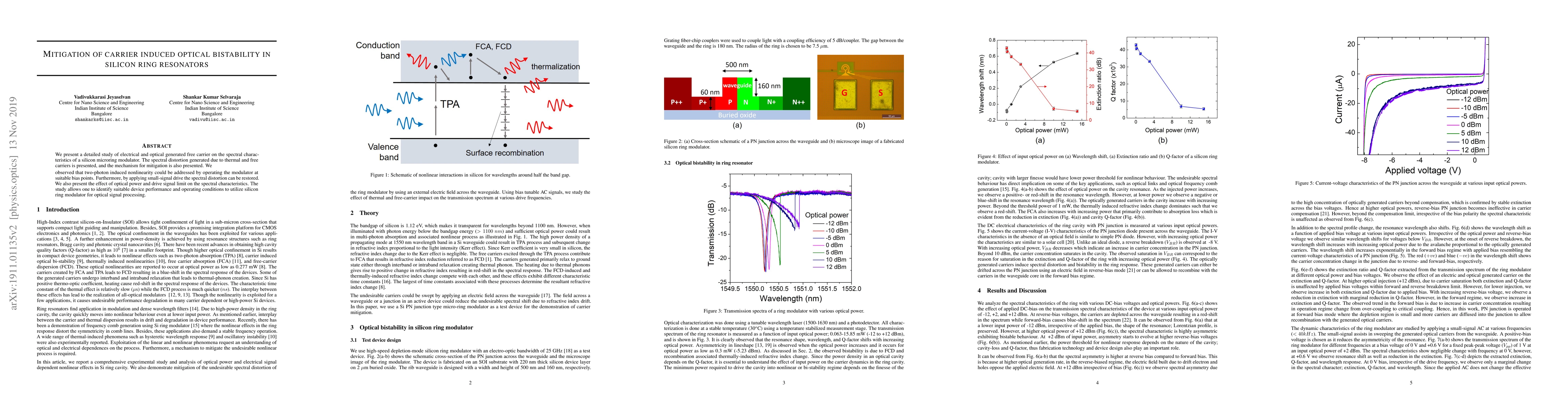 We present a detailed study of electrical and optical generated free carrier on the spectral characteristics of a silicon microring modulator. The spectral distortion generated due to thermal and free carriers is presented, and the mechanism for mitigation is also presented. We observed that two-photon induced nonlinearity could be addressed by operating the modulator at suitable bias points. Furthermore, by applying small-signal drive the spectral distortion can be restored. We also present the effect of optical power and drive signal limit on the spectral characteristics. The study allows one to identify suitable device performance and operating conditions to utilize silicon ring modulator for optical signal processing.