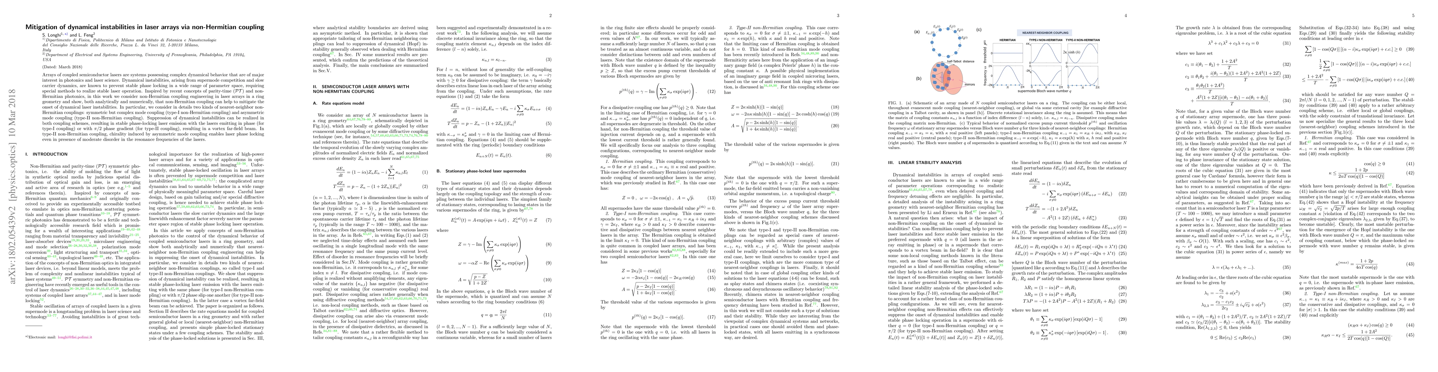 This paper explores how non-Hermitian coupling can mitigate dynamical instabilities in laser arrays, achieving stable phase-locking through two types of coupling: symmetric complex mode coupling (type-I) and asymmetric mode coupling (type-II), with the latter enabling vortex beam formation and robustness against frequency disorder.
