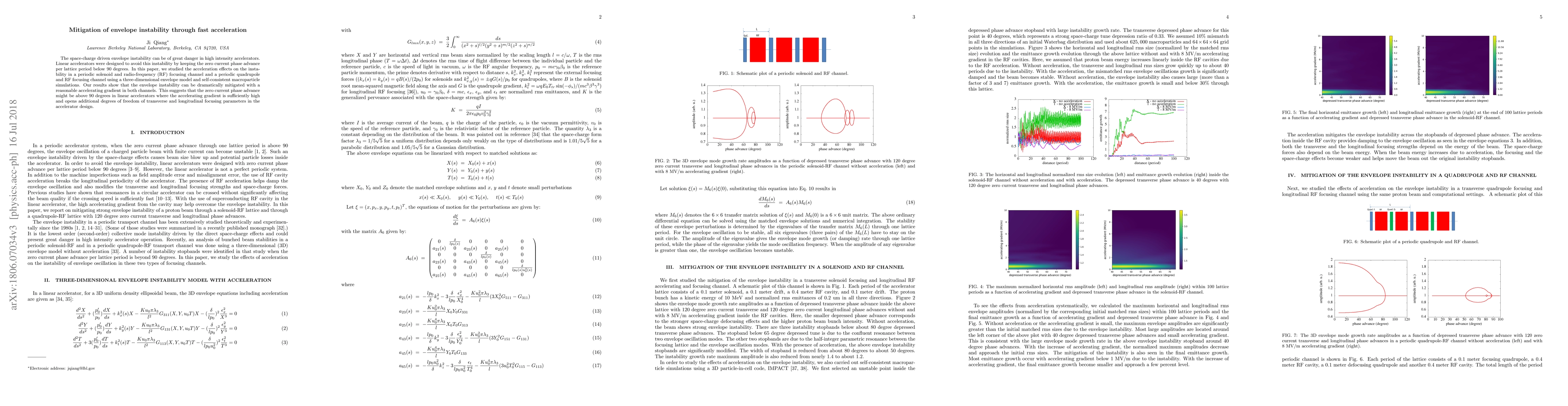 The space-charge driven envelope instability can be of great danger in high intensity accelerators. Linear accelerators were designed to avoid this instability by keeping the zero current phase advance per lattice period below 90 degrees. In this paper, we report on the acceleration effects on the instability in a periodic solenoid and radio-frequency (RF) focusing channel and a periodic quadrupole and RF focusing channel using a three-dimensional envelope model and self-consistent macroparticle simulations. The simulation results show that the envelope instability can be mitigated with a reasonable accelerating gradient in both channels. This suggests that the zero current phase advance might be above 90 degrees in linear accelerators where the accelerating gradient is sufficiently high and opens additional freedom of transverse and longitudinal focusing in the accelerator design.