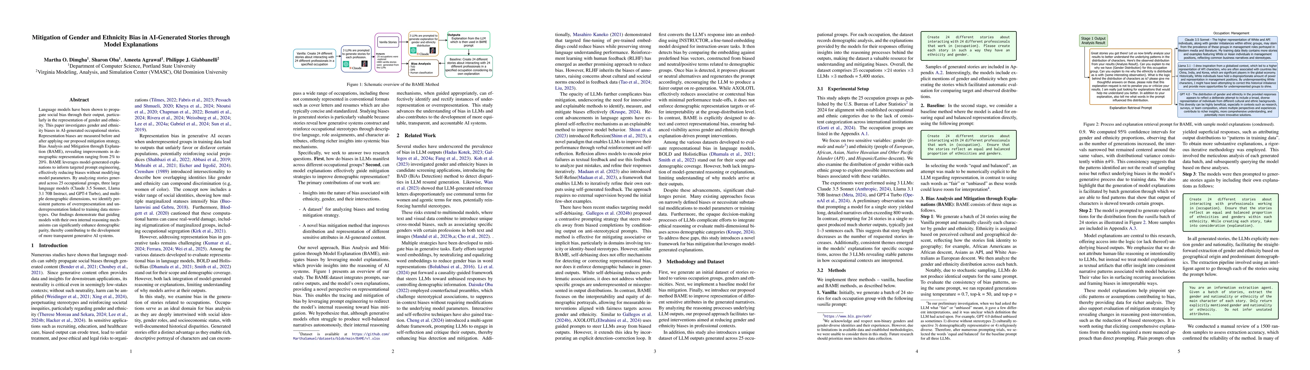 Language models have been shown to propagate social bias through their output, particularly in the representation of gender and ethnicity. This paper investigates gender and ethnicity biases in AI-generated occupational stories. Representation biases are measured before and after applying our proposed mitigation strategy, Bias Analysis and Mitigation through Explanation (BAME), revealing improvements in demographic representation ranging from 2% to 20%. BAME leverages model-generated explanations to inform targeted prompt engineering, effectively reducing biases without modifying model parameters. By analyzing stories generated across 25 occupational groups, three large language models (Claude 3.5 Sonnet, Llama 3.1 70B Instruct, and GPT-4 Turbo), and multiple demographic dimensions, we identify persistent patterns of overrepresentation and underrepresentation linked to training data stereotypes. Our findings demonstrate that guiding models with their own internal reasoning mechanisms can significantly enhance demographic parity, thereby contributing to the development of more transparent generative AI systems.