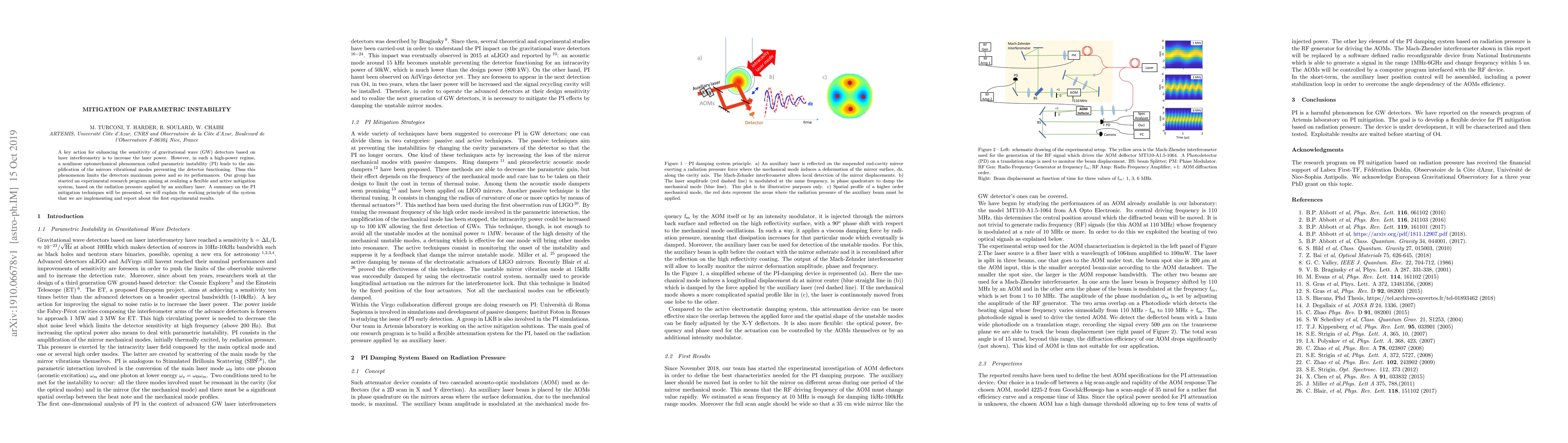 Researchers developed a system to mitigate parametric instability in gravitational wave detectors, which amplifies mirrors' vibrational modes at high laser power levels, limiting detector performance. The system uses radiation pressure from an auxiliary laser to actively stabilize the mirrors.