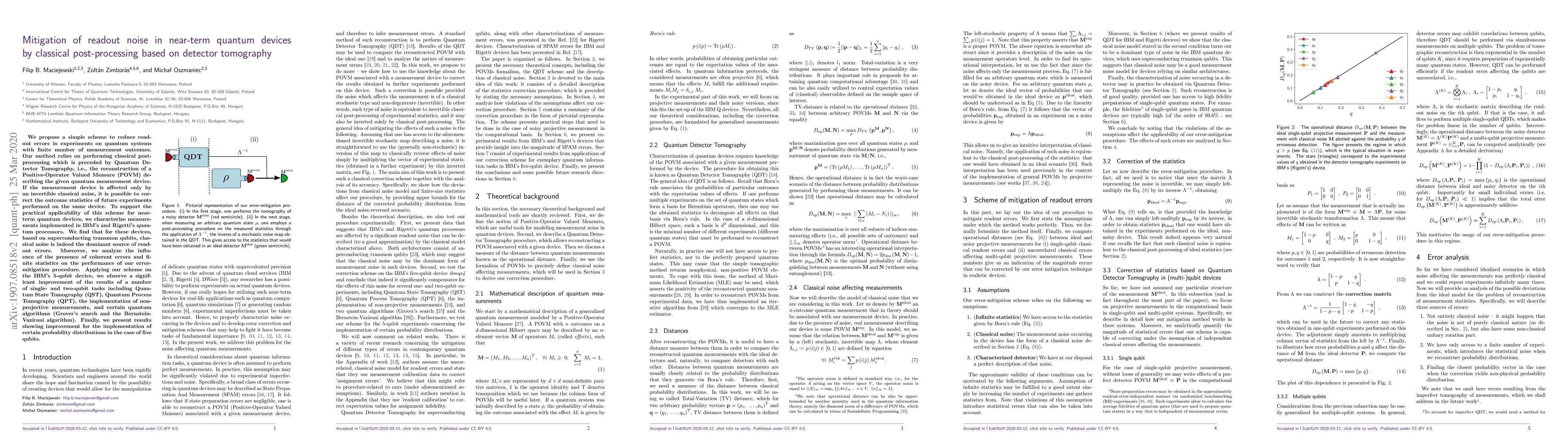 This paper proposes a classical post-processing method to mitigate readout noise in near-term quantum devices, based on Quantum Detector Tomography. The scheme significantly improves the accuracy of quantum measurements and algorithms on IBM's and Rigetti's quantum processors, highlighting its practical applicability.