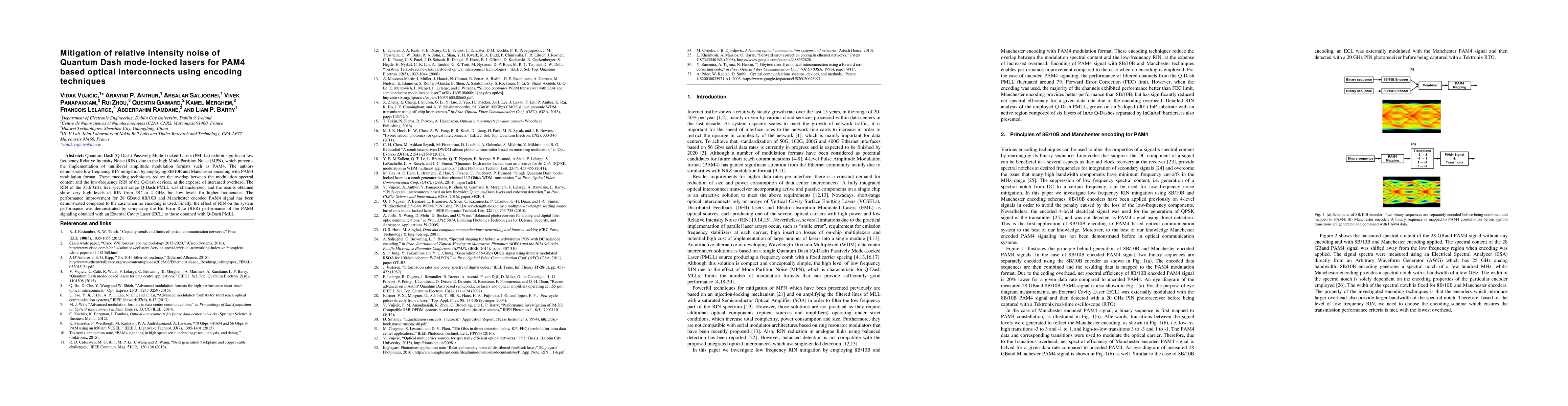 The paper presents a novel approach to mitigate low-frequency RIN in Q-Dash PMLLs using 8B/10B and Manchester encoding with PAM4 modulation, significantly improving system performance for optical interconnects.
