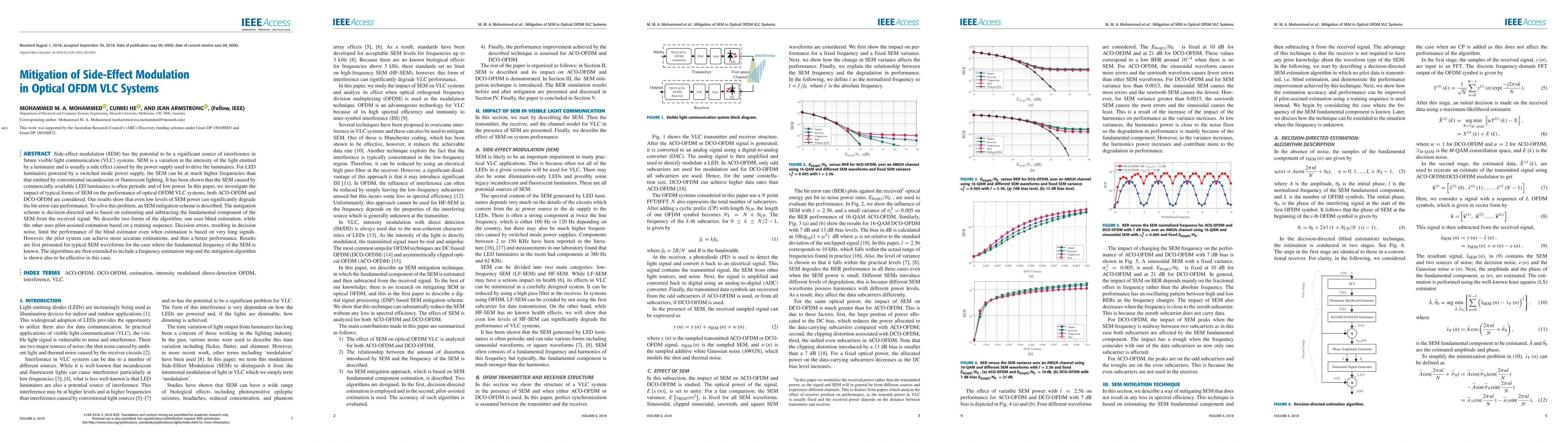 Side-effect modulation (SEM) has the potential to be a significant source of interference in future visible light communication (VLC) systems. SEM is a variation in the intensity of the light emitted by a luminaire and is usually a side-effect caused by the power supply used to drive the luminaires. For LED luminaires powered by a switched mode power supply, the SEM can be at much higher frequencies than that emitted by conventional incandescent or fluorescent lighting. It has been shown that the SEM caused by commercially available LED luminaires is often periodic and of low power. In this paper, we investigate the impact of typical forms of SEM on the performance of optical OFDM VLC systems; both ACO-OFDM and DCO-OFDM are considered. Our results show that even low levels of SEM power can significantly degrade the bit-error-rate performance. To solve this problem, an SEM mitigation scheme is described. The mitigation scheme is decision-directed and is based on estimating and subtracting the fundamental component of the SEM from the received signal. We describe two forms of the algorithm; one uses blind estimation while the other uses pilot-assisted estimation based on a training sequence. Decision errors, resulting in decision noise, limit the performance of the blind estimator even when estimation is based on very long signals. However, the pilot system can achieve more accurate estimations, thus better performance. Results are first presented for typical SEM waveforms for the case where the fundamental frequency of the SEM is known. The algorithms are then extended to include a frequency estimation step and the mitigation algorithm is shown also to be effective in this case.