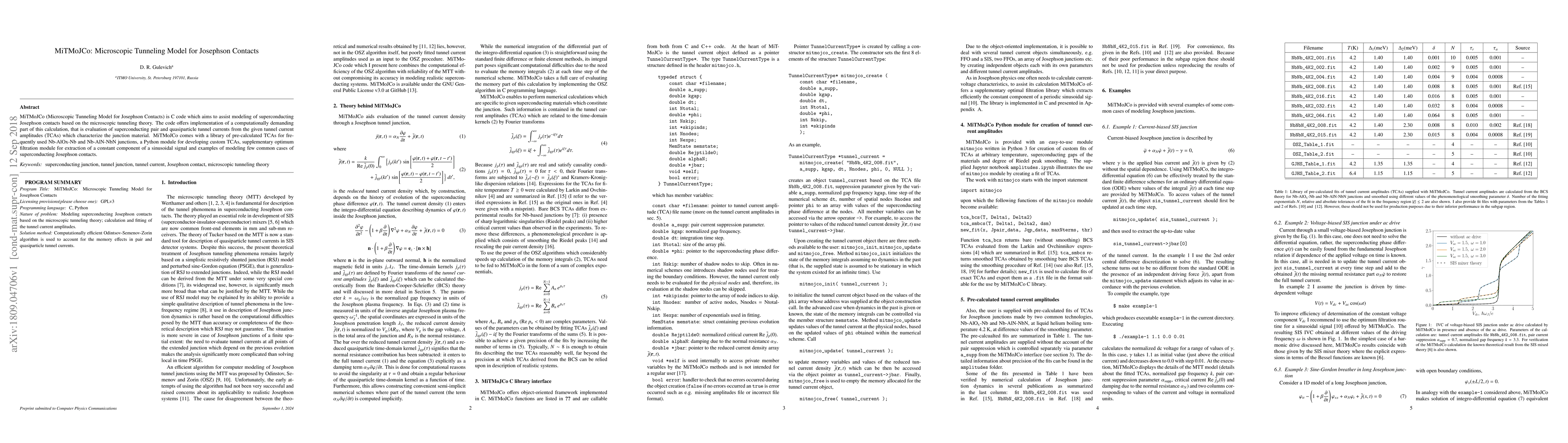 MiTMoJCo is a C code for modeling superconducting Josephson contacts using microscopic tunneling theory, featuring pre-calculated tunnel current amplitudes for common junctions and a Python module for custom TCAs. It also includes a filtration module for signal processing.