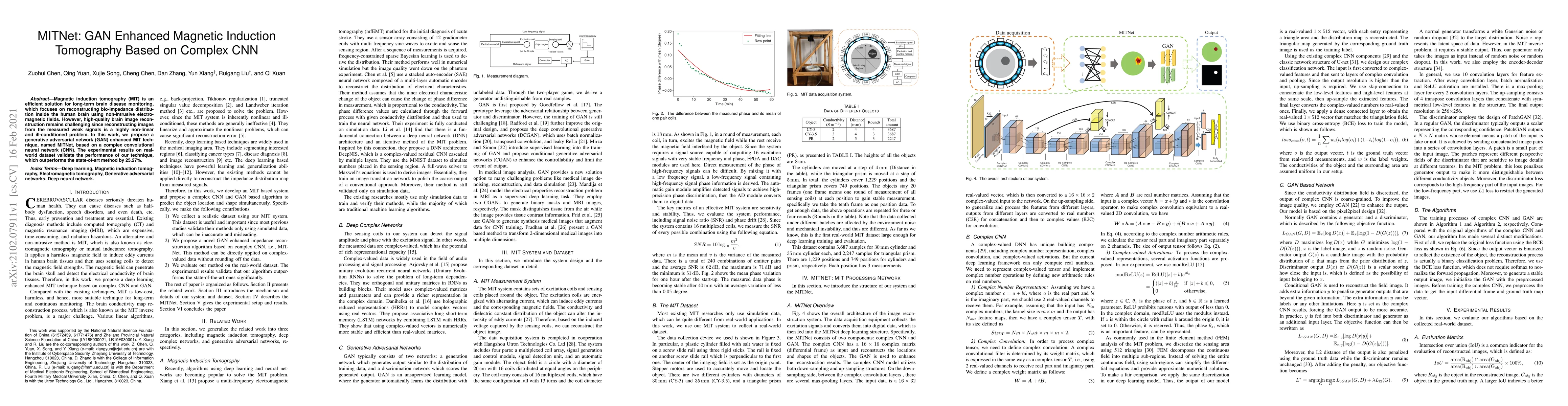 MITNet leverages a generative adversarial network (GAN) enhanced by complex convolutional neural networks (CNN) to improve magnetic induction tomography (MIT) for brain disease monitoring. The proposed method significantly outperforms existing techniques, achieving a 25.27% improvement in image reconstruction quality from weak electromagnetic signals.