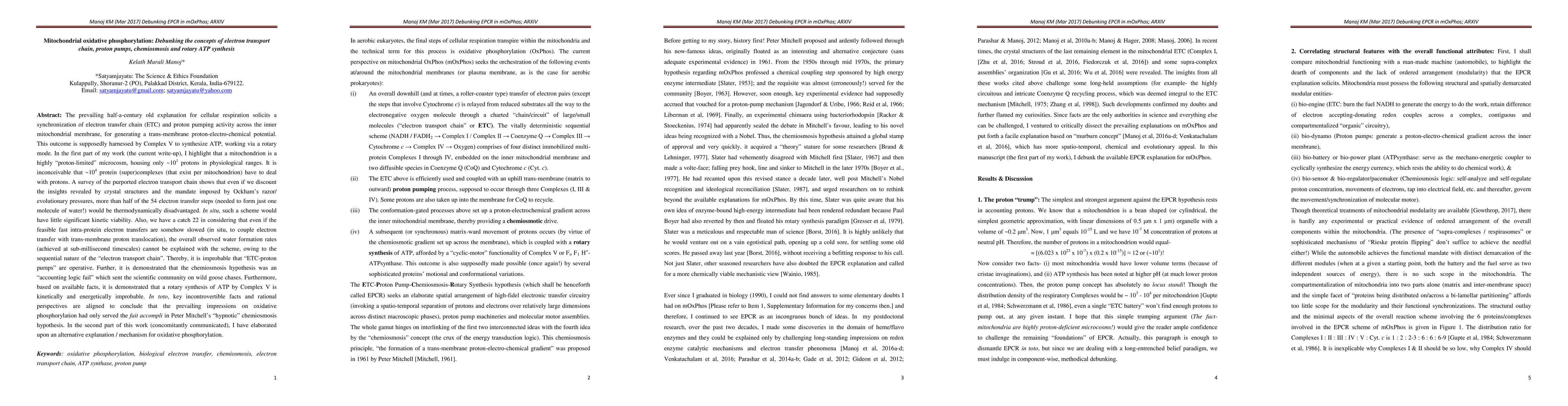Herein (the first part of my work), I debunk the long-standing hypotheses that explain mitochondrial oxidative phosphorylation. Simple calculations point out that mitochondria are highly proton-deficient microcosms and therefore, elaborate proton pump machinery are not tenable. Further, other elements like the elaborate electron transport chain, chemiosmosis, rotary ATP synthesis, etc. are also critically evaluated to point out that such complicated systems are non-viable. The communication necessitates a new explanatory paradigm for cellular respiration. In the second part of my work, I have put forward a viable alternative explanatory paradigm for mitochondrial oxidative phosphorylation.