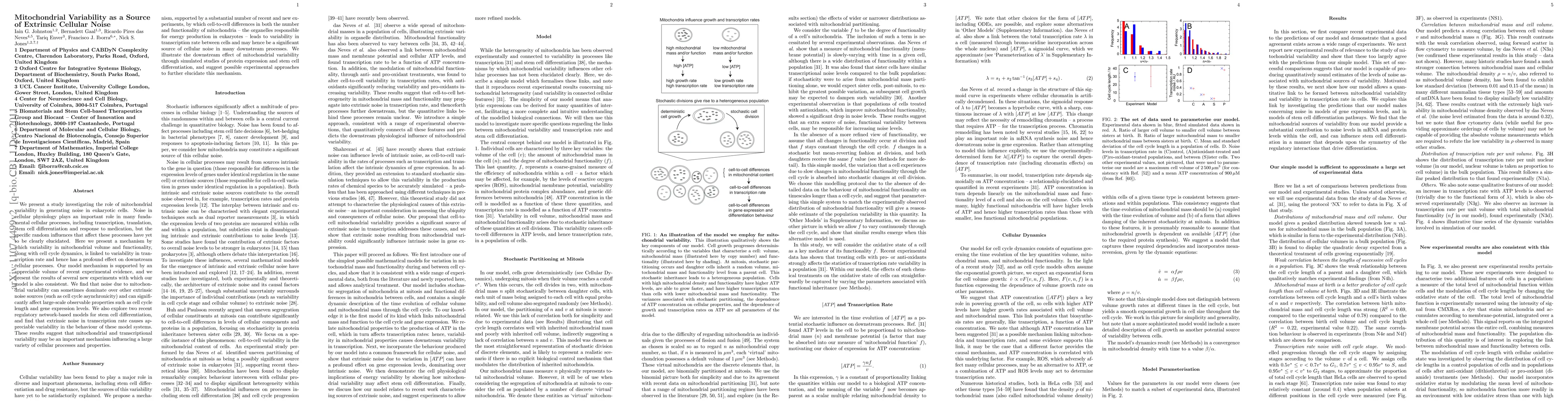 We present a study investigating the role of mitochondrial variability in generating noise in eukaryotic cells. Noise in cellular physiology plays an important role in many fundamental cellular processes, including transcription, translation, stem cell differentiation and response to medication, but the specific random influences that affect these processes have yet to be clearly elucidated. Here we present a mechanism by which variability in mitochondrial volume and functionality, along with cell cycle dynamics, is linked to variability in transcription rate and hence has a profound effect on downstream cellular processes. Our model mechanism is supported by an appreciable volume of recent experimental evidence, and we present the results of several new experiments with which our model is also consistent. We find that noise due to mitochondrial variability can sometimes dominate over other extrinsic noise sources (such as cell cycle asynchronicity) and can significantly affect large-scale observable properties such as cell cycle length and gene expression levels. We also explore two recent regulatory network-based models for stem cell differentiation, and find that extrinsic noise in transcription rate causes appreciable variability in the behaviour of these model systems. These results suggest that mitochondrial and transcriptional variability may be an important mechanism influencing a large variety of cellular processes and properties.