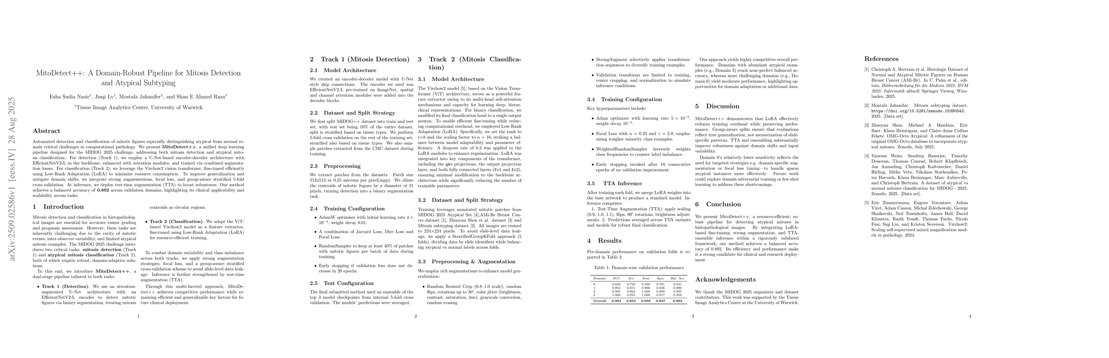 Automated detection and classification of mitotic figures especially distinguishing atypical from normal remain critical challenges in computational pathology. We present MitoDetect++, a unified deep learning pipeline designed for the MIDOG 2025 challenge, addressing both mitosis detection and atypical mitosis classification. For detection (Track 1), we employ a U-Net-based encoder-decoder architecture with EfficientNetV2-L as the backbone, enhanced with attention modules, and trained via combined segmentation losses. For classification (Track 2), we leverage the Virchow2 vision transformer, fine-tuned efficiently using Low-Rank Adaptation (LoRA) to minimize resource consumption. To improve generalization and mitigate domain shifts, we integrate strong augmentations, focal loss, and group-aware stratified 5-fold cross-validation. At inference, we deploy test-time augmentation (TTA) to boost robustness. Our method achieves a balanced accuracy of 0.892 across validation domains, highlighting its clinical applicability and scalability across tasks.