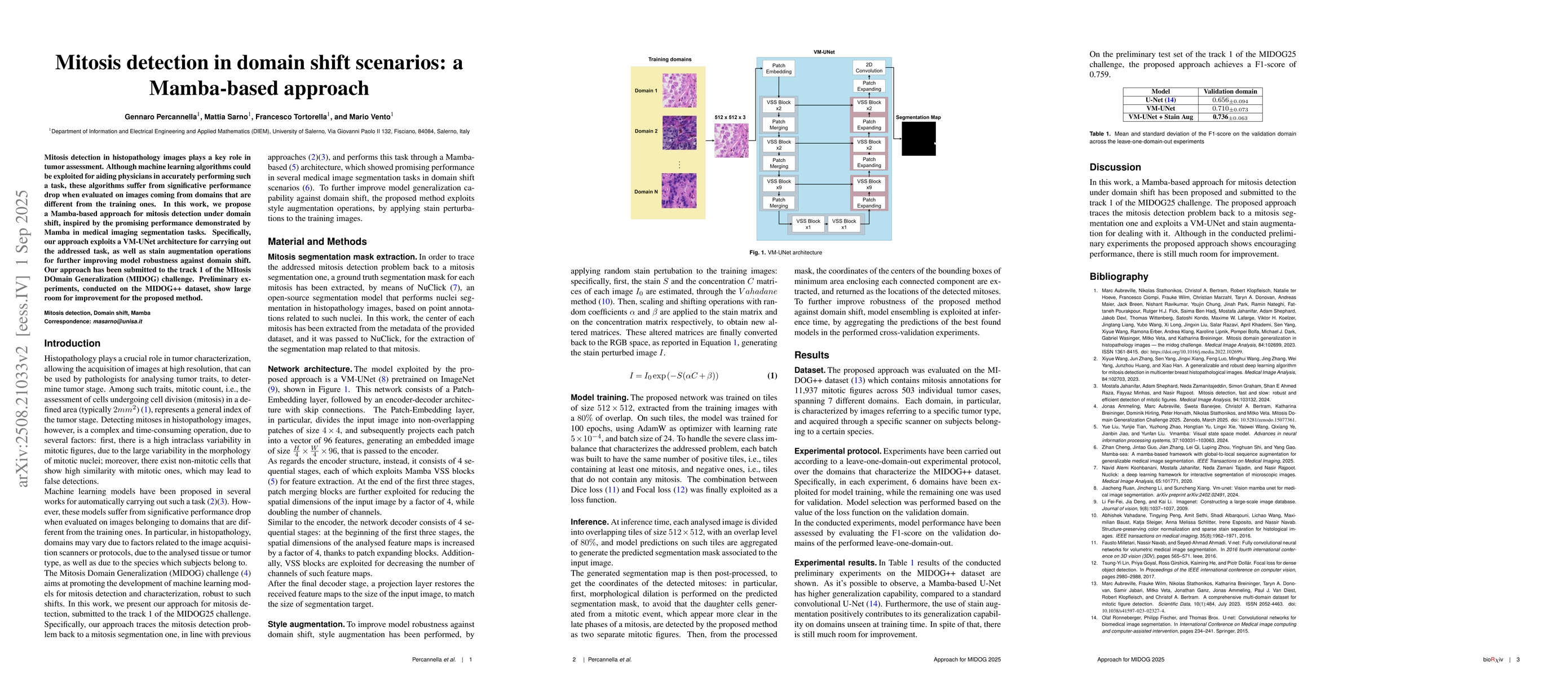 Mitosis detection in histopathology images plays a key role in tumor assessment. Although machine learning algorithms could be exploited for aiding physicians in accurately performing such a task, these algorithms suffer from significative performance drop when evaluated on images coming from domains that are different from the training ones. In this work, we propose a Mamba-based approach for mitosis detection under domain shift, inspired by the promising performance demonstrated by Mamba in medical imaging segmentation tasks. Specifically, our approach exploits a VM-UNet architecture for carrying out the addressed task, as well as stain augmentation operations for further improving model robustness against domain shift. Our approach has been submitted to the track 1 of the MItosis DOmain Generalization (MIDOG) challenge. Preliminary experiments, conducted on the MIDOG++ dataset, show large room for improvement for the proposed method.