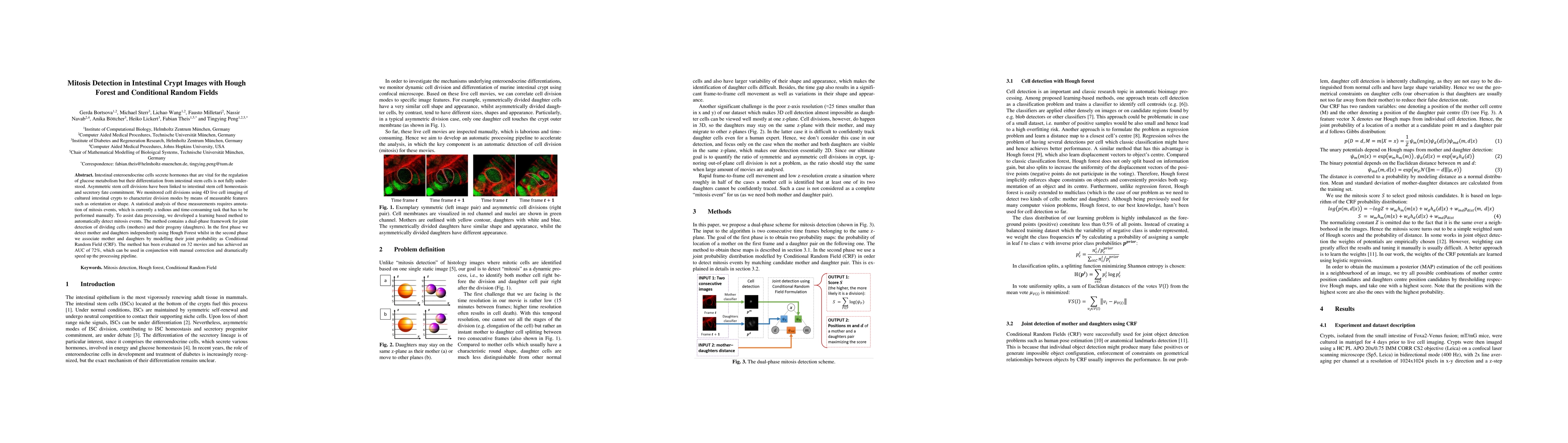 This paper presents a dual-phase framework using Hough Forest and Conditional Random Fields for automatic detection of mitosis events in intestinal crypt images, aiming to streamline the analysis of 4D live cell imaging data. The method achieved an AUC of 72% and can significantly reduce the time-consuming manual annotation process.