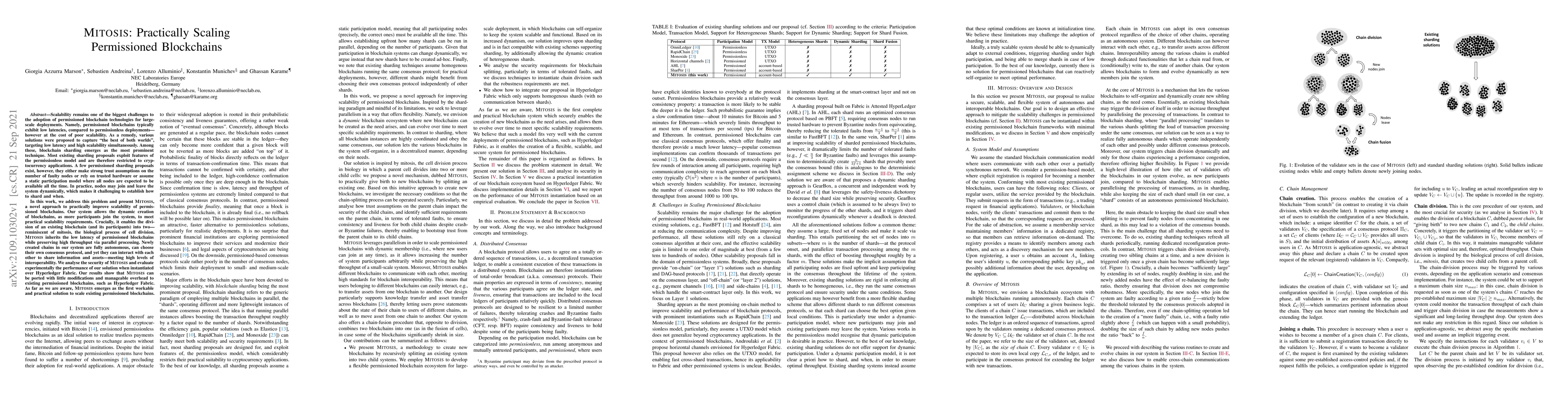 MITOSIS introduces a novel method to enhance the scalability of permissioned blockchains by dynamically creating new blockchains as participants increase, enabling parallel processing and high throughput while maintaining low latency. The system allows existing blockchains to split autonomously, ensuring interoperability and security, and was experimentally validated on Hyperledger Fabric.