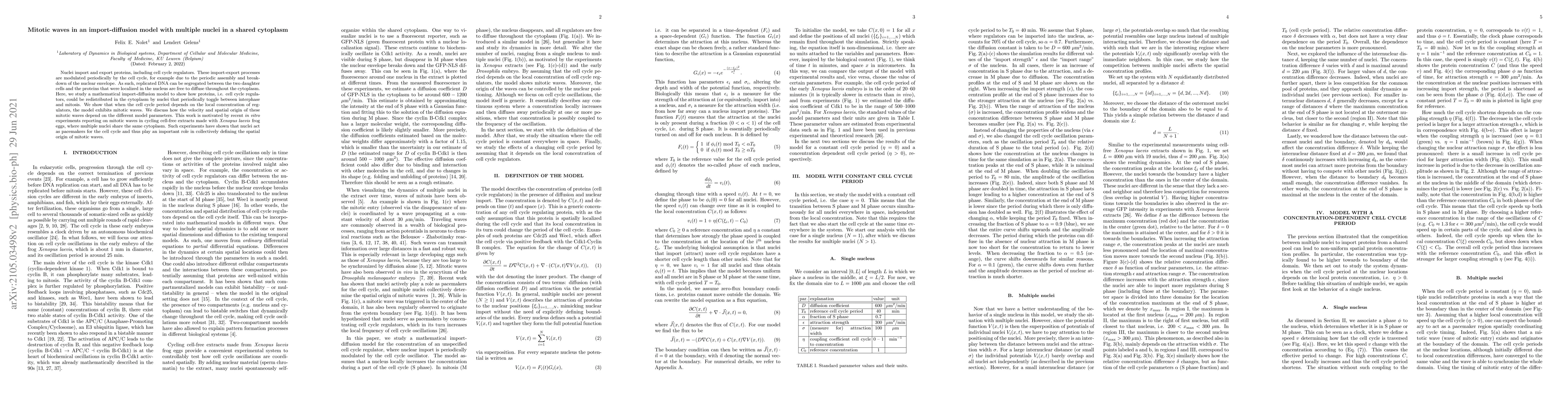 This paper investigates a mathematical import-diffusion model to demonstrate how cell cycle regulators can be redistributed in a shared cytoplasm by nuclei that cycle between interphase and mitosis. The study reveals that mitotic waves emerge when the cell cycle period is influenced by the local concentration of regulators, and discusses how these waves' velocity and origin are affected by various model parameters.