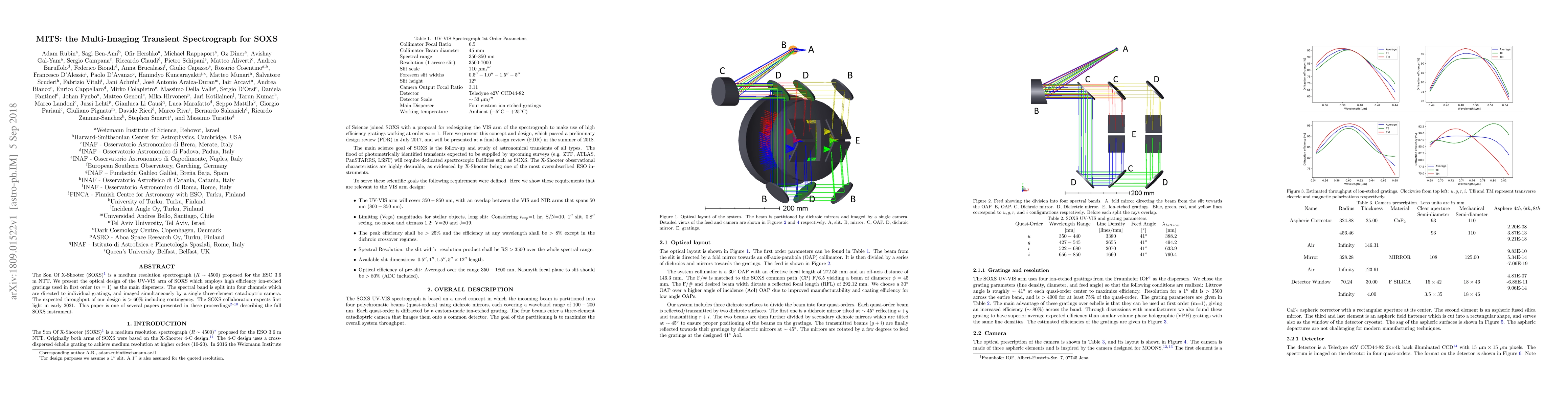 The MITS is a UV-VIS arm of the proposed SOXS spectrograph, utilizing high-efficiency ion-etched gratings and a three-element catadioptric camera to split and image spectral bands across four channels, with an expected throughput exceeding 60%. The SOXS collaboration anticipates first light in early 2021.