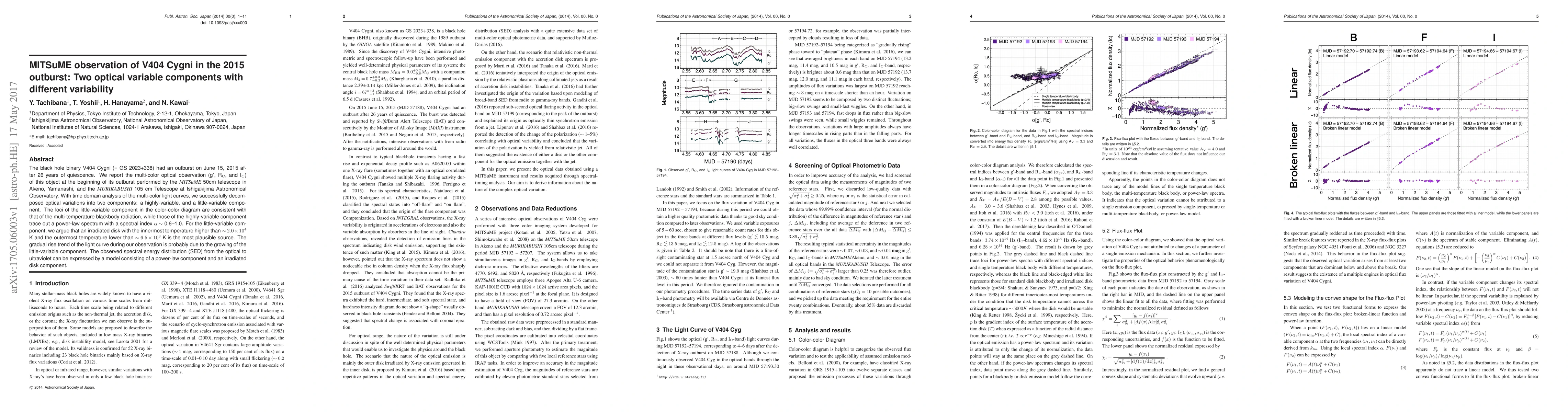 The black hole binary V404 Cygni (= GS 2023+338) had an outburst on June 15, 2015 after 26 years of quiescence. We report the multi-color optical observation (g', Rc, and Ic) of this object at the beginning of its outburst performed by the MITSuME 50cm telescope in Akeno, Yamanashi, and the MURIKABUSHI 105 cm Telescope at Ishigakijima Astronomical Observatory. With time domain analysis of the multi-color light curves, we successfully decomposed optical variations into two components: a highly-variable, and a little-variable component. The loci of the little-variable component in the color-color diagram are consistent with that of the multi-temperature blackbody radiation, while those of the highly-variable component trace out a power-law spectrum with a spectral index {\alpha}~0.6-1.0. For the little-variable component, we argue that an irradiated disk with the innermost temperature higher than ~2.0$\times10^4$ K and the outermost temperature lower than ~6.5$\times10^3$ K is the most plausible source. The gradual rise trend of the light curve during our observation is probably due to the growing of the little-variable component. The observed spectral energy distribution (SED) from the optical to ultraviolet can be expressed by a model consisting of a power-law component and an irradiated disk component.