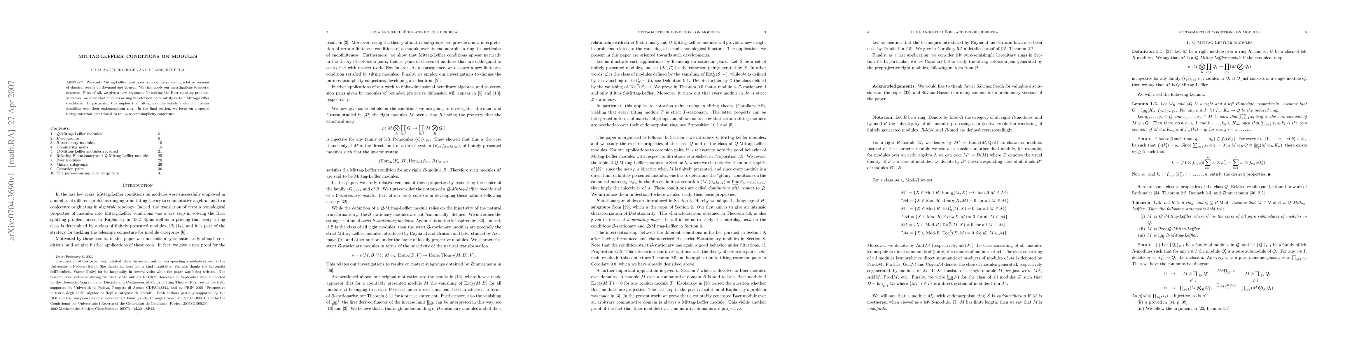 This paper explores the Mittag-Leffler conditions on modules, offering new insights and applications to solve the Baer splitting problem and investigate cotorsion pairs. It demonstrates that tilting modules meet a useful finiteness condition over their endomorphism ring and discusses a specific tilting cotorsion pair linked to the pure-semisimplicity conjecture.