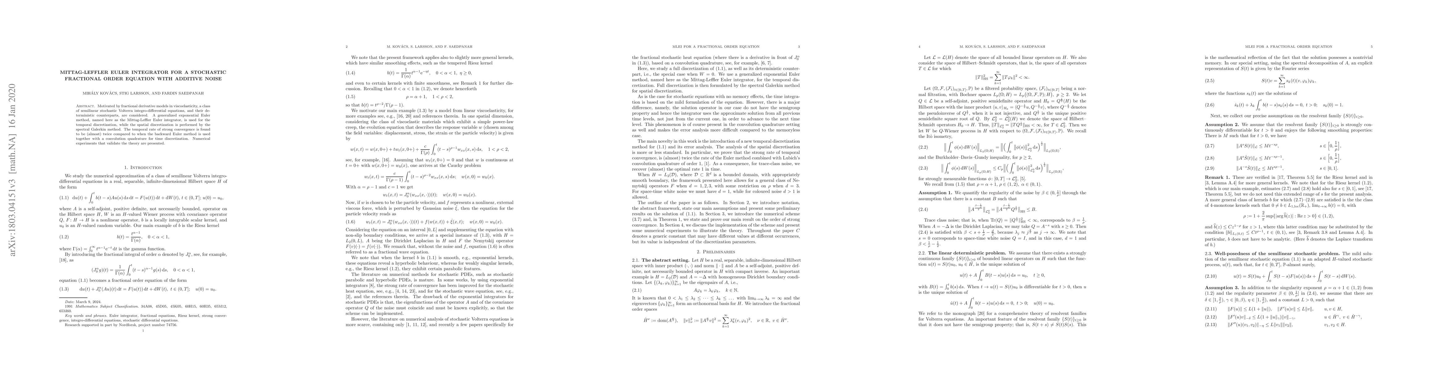 This paper proposes a new Mittag-Leffler Euler integrator for solving stochastic fractional order differential equations with additive noise. The method shows a temporal rate of strong convergence nearly double that of the backward Euler method, validated through numerical experiments.