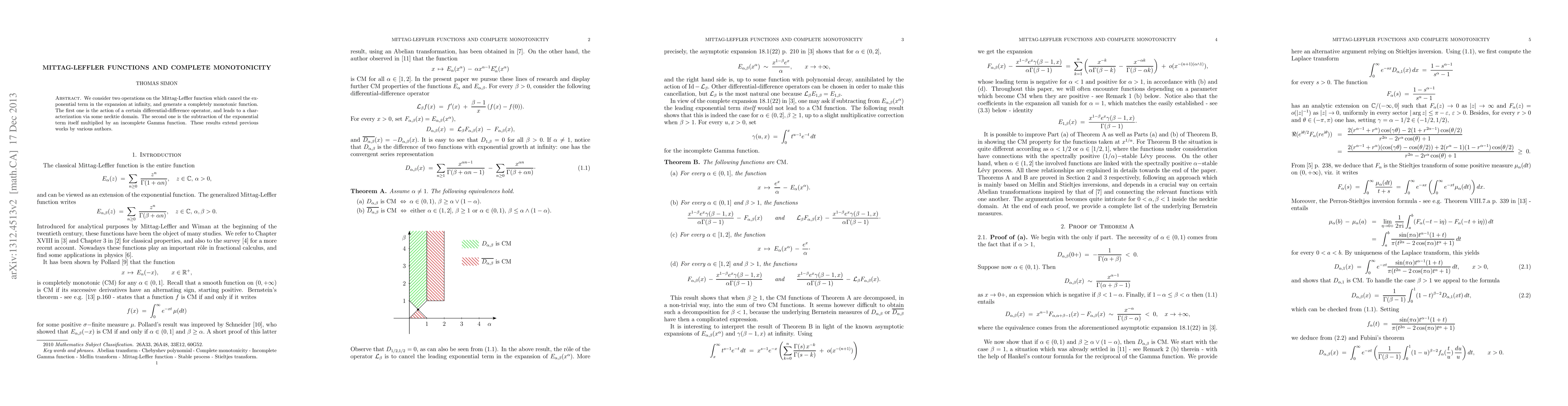 We consider two operations on the Mittag-Leffler function which cancel the exponential term in the expansion at infinity, and generate a completely monotonic function. The first one is the action of a certain differential-difference operator, and leads to a characterization via some necktie domain. The second one is the subtraction of the exponential term itself multiplied by an incomplete Gamma function. These results extend previous works by various authors.