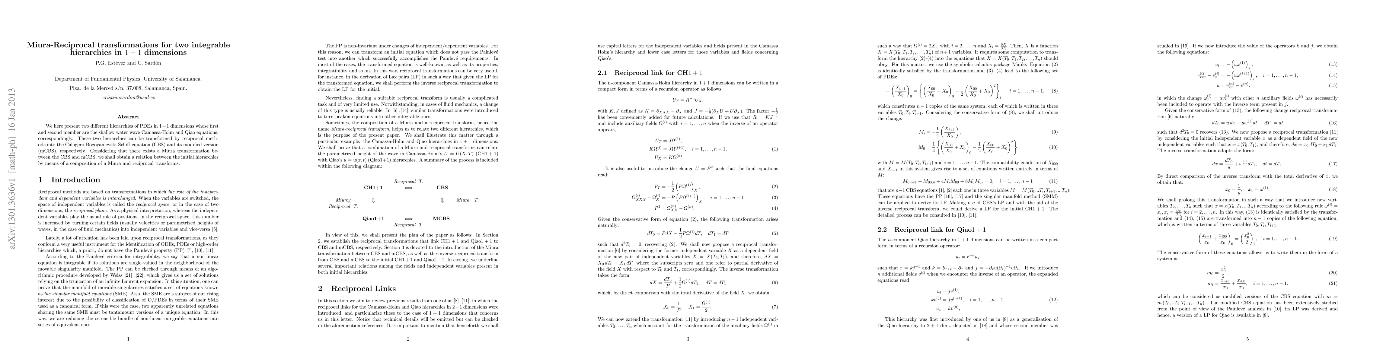 We here present two different hierarchies of PDEs in 1+1 dimensions whose first and second member are the shallow water wave Camassa-Holm and Qiao equations, correspondingly. These two hierarchies can be transformed by reciprocal methods into the Calogero-Bogoyanlevski-Schiff equation (CBS) and its modified version (mCBS), respectively. Considering that there exists a Miura transformation between the CBS and mCBS, we shall obtain a relation between the initial hierarchies by means of a composition of a Miura and reciprocal transforms.