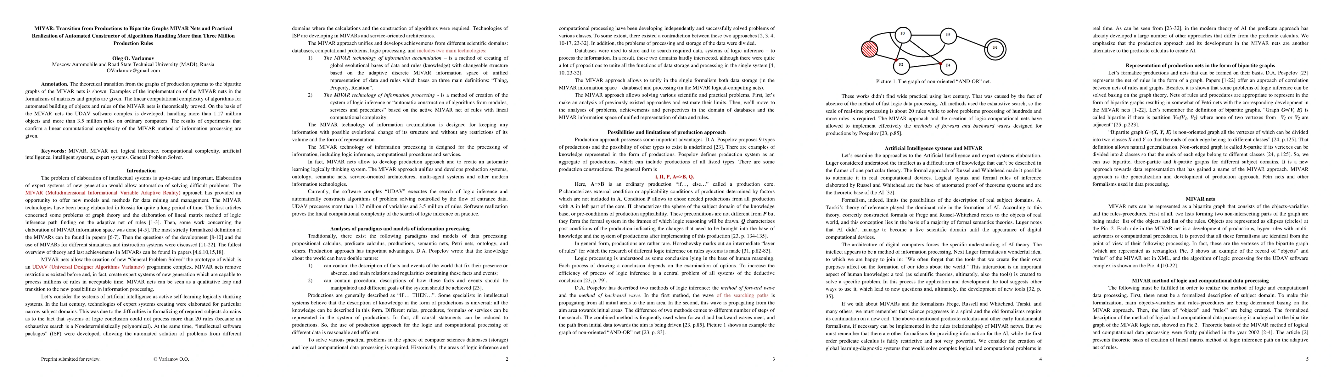 The theoretical transition from the graphs of production systems to the bipartite graphs of the MIVAR nets is shown. Examples of the implementation of the MIVAR nets in the formalisms of matrixes and graphs are given. The linear computational complexity of algorithms for automated building of objects and rules of the MIVAR nets is theoretically proved. On the basis of the MIVAR nets the UDAV software complex is developed, handling more than 1.17 million objects and more than 3.5 million rules on ordinary computers. The results of experiments that confirm a linear computational complexity of the MIVAR method of information processing are given. Keywords: MIVAR, MIVAR net, logical inference, computational complexity, artificial intelligence, intelligent systems, expert systems, General Problem Solver.