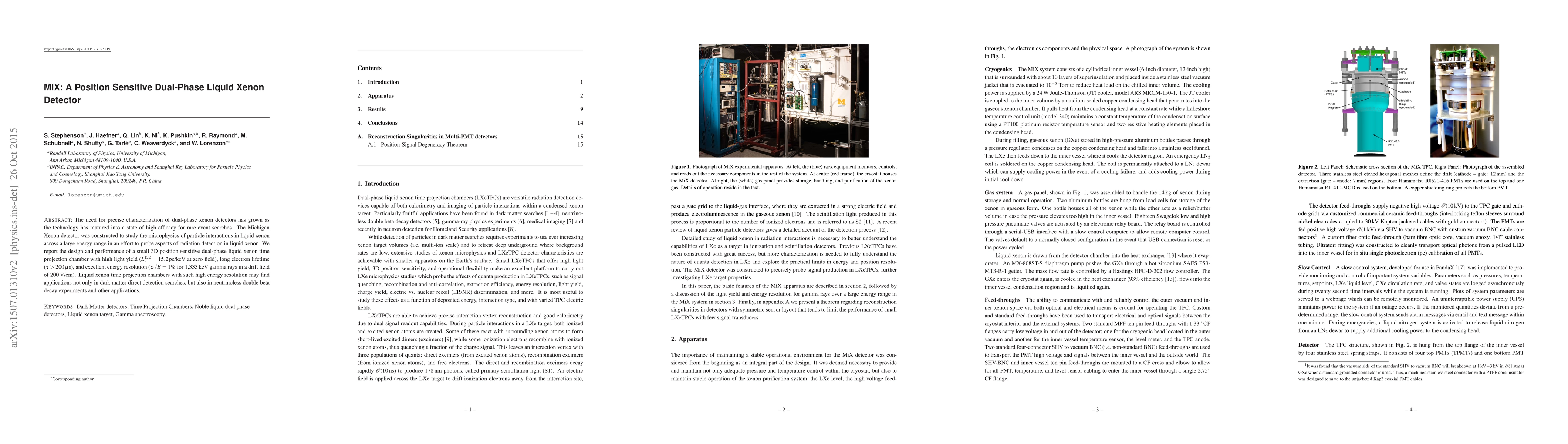 The Michigan Xenon (MiX) detector is a small, 3D position-sensitive dual-phase liquid xenon time projection chamber designed for precise characterization of particle interactions. It exhibits high light yield, long electron lifetime, and excellent energy resolution, making it suitable for dark matter searches and neutrinoless double beta decay experiments.