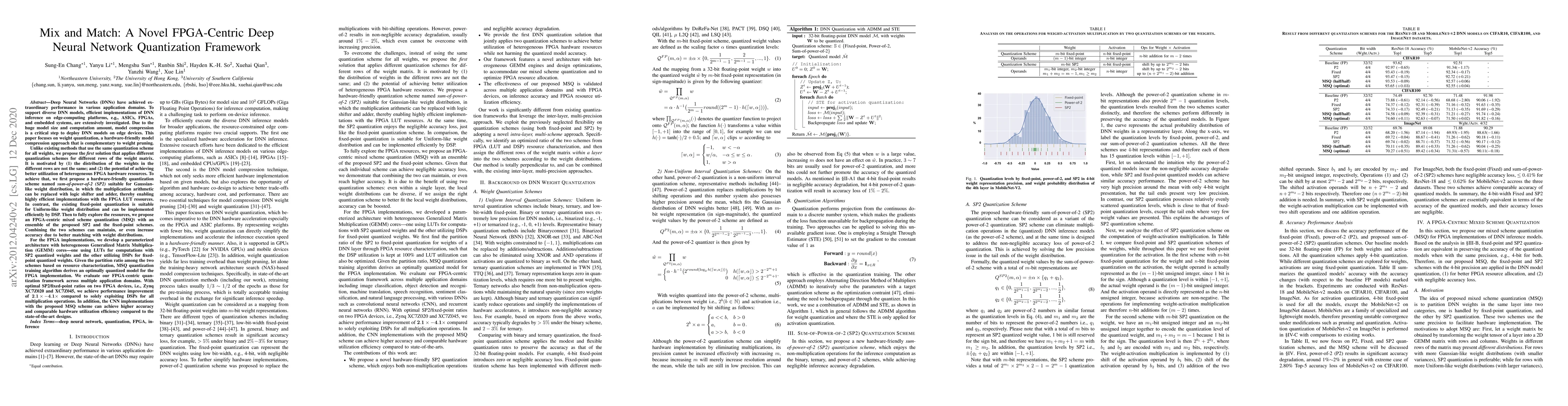 This paper proposes a novel FPGA-centric deep neural network quantization framework that applies different quantization schemes for different rows of the weight matrix to optimize hardware utilization. It introduces a sum-of-power-of-2 (SP2) quantization scheme for Gaussian-like weight distributions and combines it with a fixed-point scheme for Uniform-like distributions to achieve efficient FPGA implementations and potentially higher accuracy.