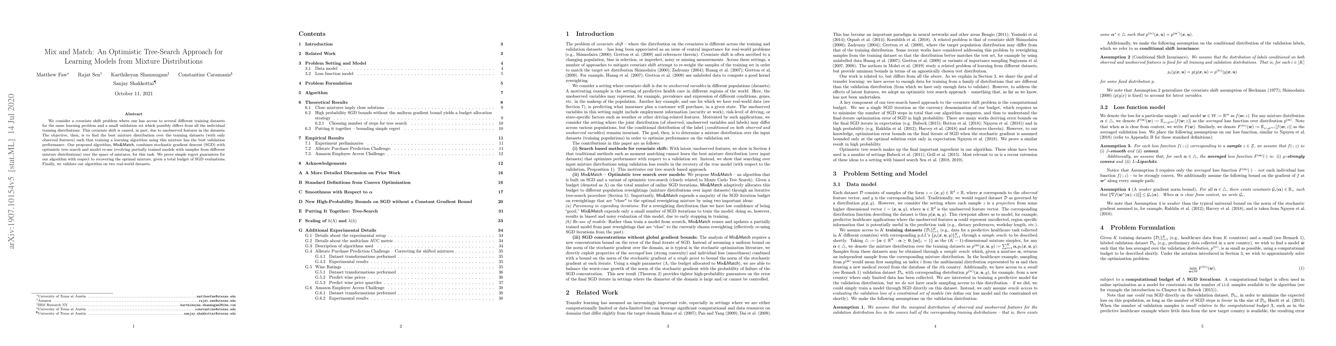 We consider a covariate shift problem where one has access to several different training datasets for the same learning problem and a small validation set which possibly differs from all the individual training distributions. This covariate shift is caused, in part, due to unobserved features in the datasets. The objective, then, is to find the best mixture distribution over the training datasets (with only observed features) such that training a learning algorithm using this mixture has the best validation performance. Our proposed algorithm, ${\sf Mix\&Match}$, combines stochastic gradient descent (SGD) with optimistic tree search and model re-use (evolving partially trained models with samples from different mixture distributions) over the space of mixtures, for this task. We prove simple regret guarantees for our algorithm with respect to recovering the optimal mixture, given a total budget of SGD evaluations. Finally, we validate our algorithm on two real-world datasets.
