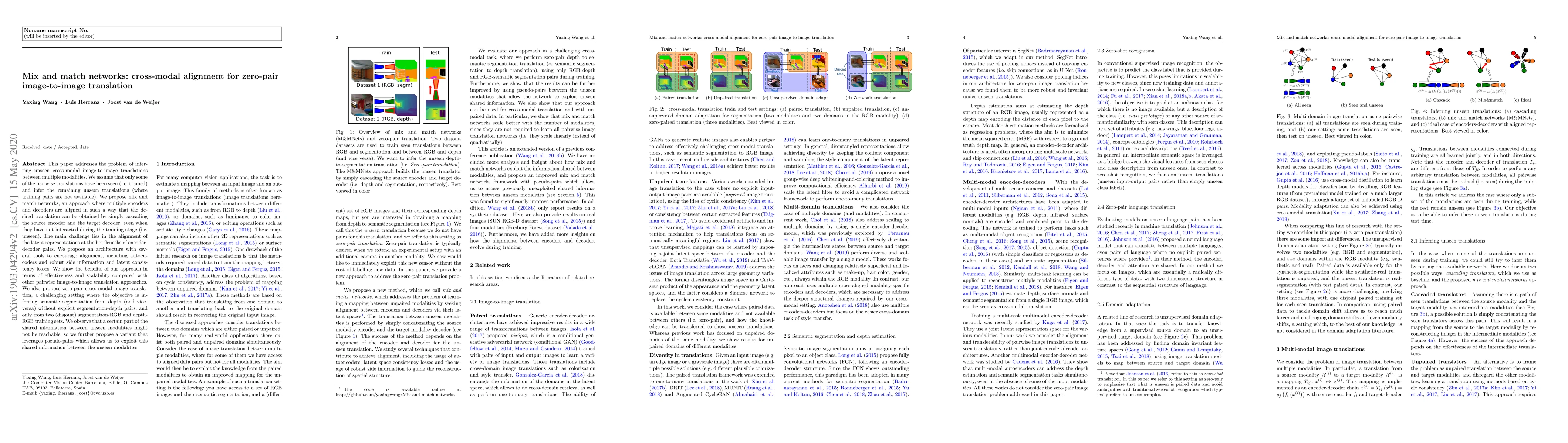 This paper proposes mix and match networks to infer unseen cross-modal image-to-image translations without training pairs for those translations. It introduces an architecture that aligns encoders and decoders to facilitate cascading for desired translations, even when they haven't been trained together, and explores zero-pair translation to infer semantic segmentation from depth without explicit training pairs.