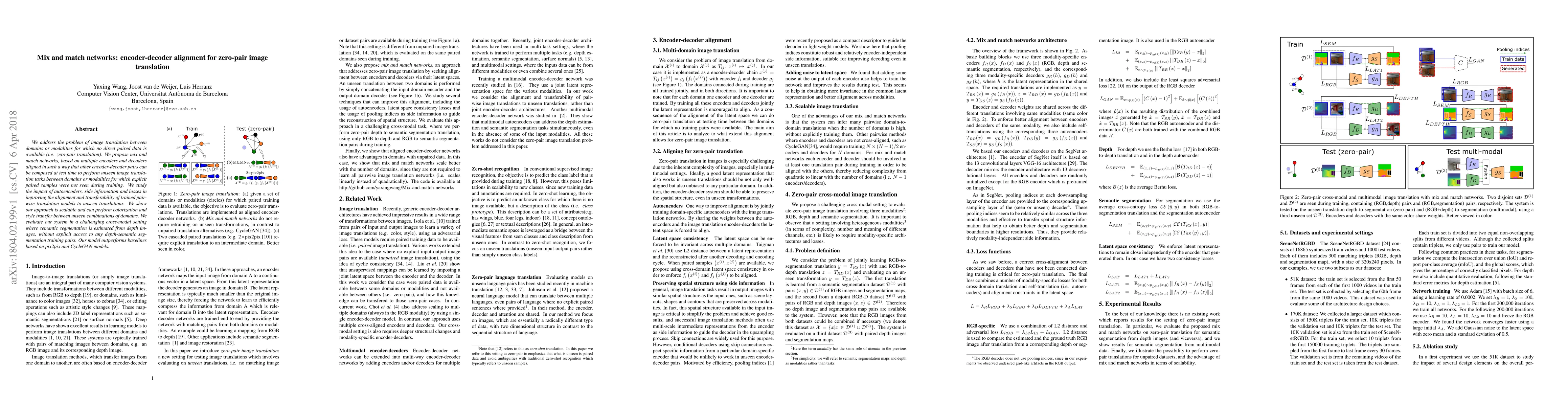 This paper proposes mix and match networks for zero-pair image translation, enabling translation between unseen domain pairs without paired training data. The approach uses aligned encoder-decoder pairs that can be composed at test time, demonstrating scalability in tasks like colorization and style transfer.