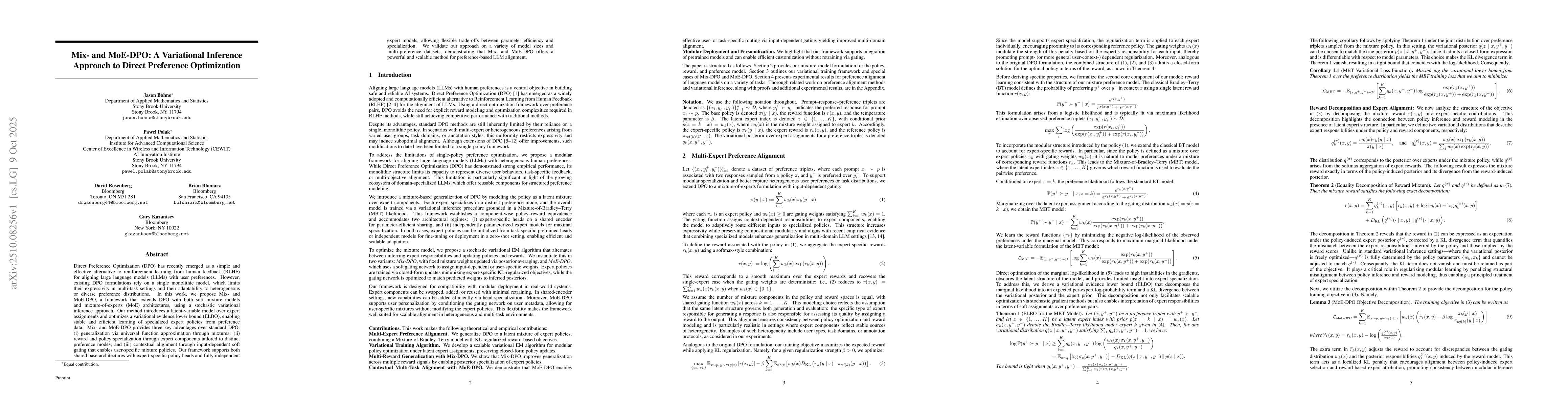 The research employs a variational EM algorithm combined with Monte Carlo relaxation techniques to optimize the Mix-and-MoE-DPO framework for preference learning. It integrates latent variable modeling with differentiable training through Gumbel-Softmax reparameterization, enabling scalable and modular expert allocation.