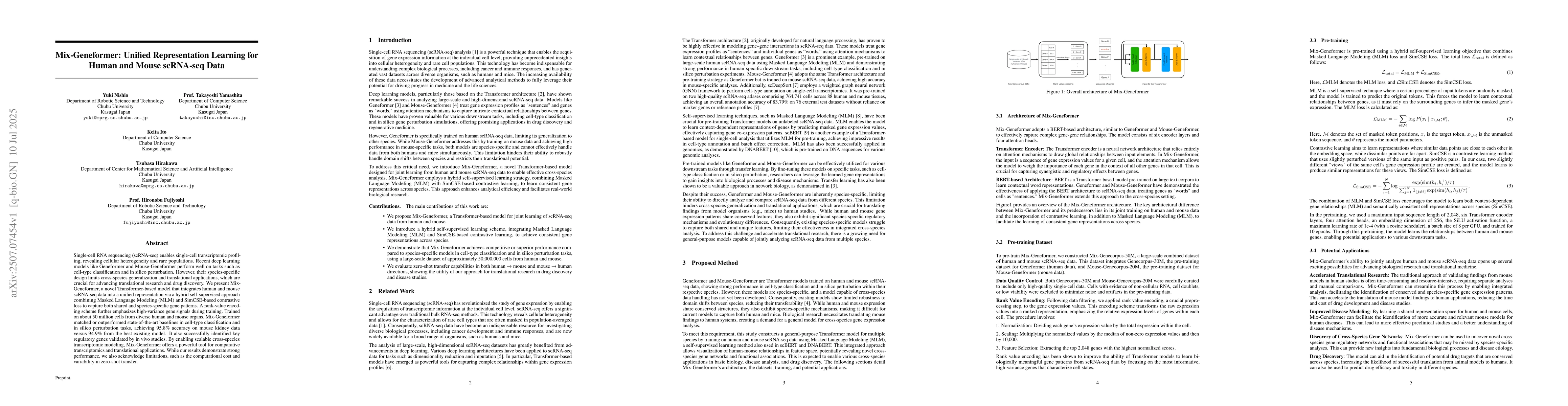 Mix-Geneformer is a Transformer-based model that combines human and mouse scRNA-seq data into a unified representation, enhancing cross-species generalization. It outperforms existing models in tasks like cell-type classification and in silico perturbation, offering valuable insights for translational research and drug discovery.
