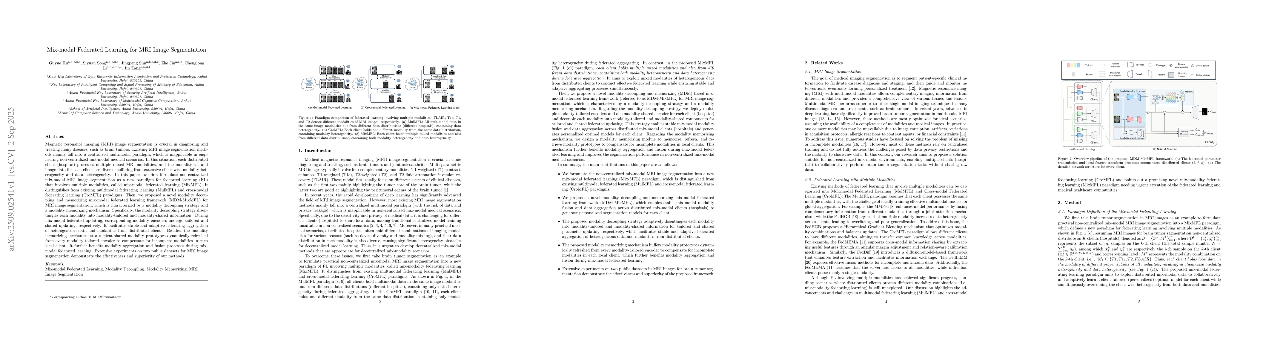 Magnetic resonance imaging (MRI) image segmentation is crucial in diagnosing and treating many diseases, such as brain tumors. Existing MRI image segmentation methods mainly fall into a centralized multimodal paradigm, which is inapplicable in engineering non-centralized mix-modal medical scenarios. In this situation, each distributed client (hospital) processes multiple mixed MRI modalities, and the modality set and image data for each client are diverse, suffering from extensive client-wise modality heterogeneity and data heterogeneity. In this paper, we first formulate non-centralized mix-modal MRI image segmentation as a new paradigm for federated learning (FL) that involves multiple modalities, called mix-modal federated learning (MixMFL). It distinguishes from existing multimodal federating learning (MulMFL) and cross-modal federating learning (CroMFL) paradigms. Then, we proposed a novel modality decoupling and memorizing mix-modal federated learning framework (MDM-MixMFL) for MRI image segmentation, which is characterized by a modality decoupling strategy and a modality memorizing mechanism. Specifically, the modality decoupling strategy disentangles each modality into modality-tailored and modality-shared information. During mix-modal federated updating, corresponding modality encoders undergo tailored and shared updating, respectively. It facilitates stable and adaptive federating aggregation of heterogeneous data and modalities from distributed clients. Besides, the modality memorizing mechanism stores client-shared modality prototypes dynamically refreshed from every modality-tailored encoder to compensate for incomplete modalities in each local client. It further benefits modality aggregation and fusion processes during mixmodal federated learning. Extensive experiments on two public datasets for MRI image segmentation demonstrate the effectiveness and superiority of our methods.