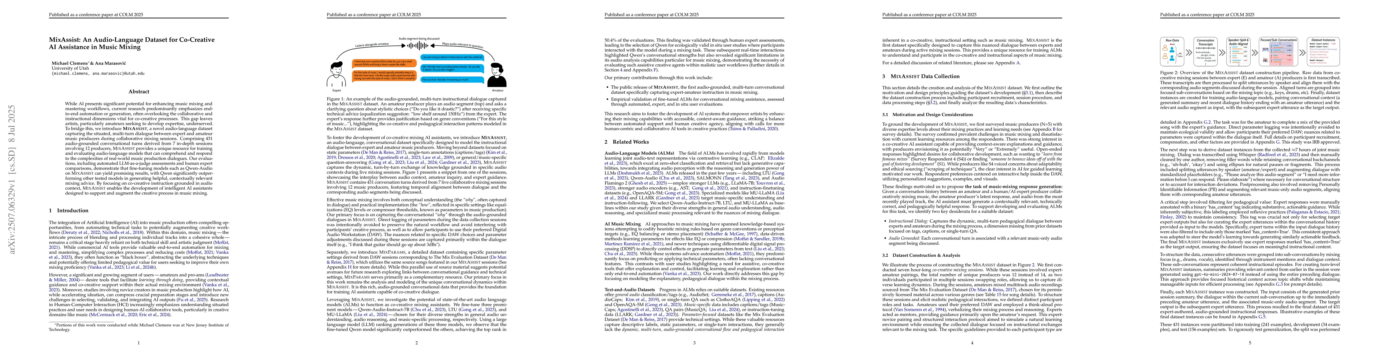 While AI presents significant potential for enhancing music mixing and mastering workflows, current research predominantly emphasizes end-to-end automation or generation, often overlooking the collaborative and instructional dimensions vital for co-creative processes. This gap leaves artists, particularly amateurs seeking to develop expertise, underserved. To bridge this, we introduce MixAssist, a novel audio-language dataset capturing the situated, multi-turn dialogue between expert and amateur music producers during collaborative mixing sessions. Comprising 431 audio-grounded conversational turns derived from 7 in-depth sessions involving 12 producers, MixAssist provides a unique resource for training and evaluating audio-language models that can comprehend and respond to the complexities of real-world music production dialogues. Our evaluations, including automated LLM-as-a-judge assessments and human expert comparisons, demonstrate that fine-tuning models such as Qwen-Audio on MixAssist can yield promising results, with Qwen significantly outperforming other tested models in generating helpful, contextually relevant mixing advice. By focusing on co-creative instruction grounded in audio context, MixAssist enables the development of intelligent AI assistants designed to support and augment the creative process in music mixing.