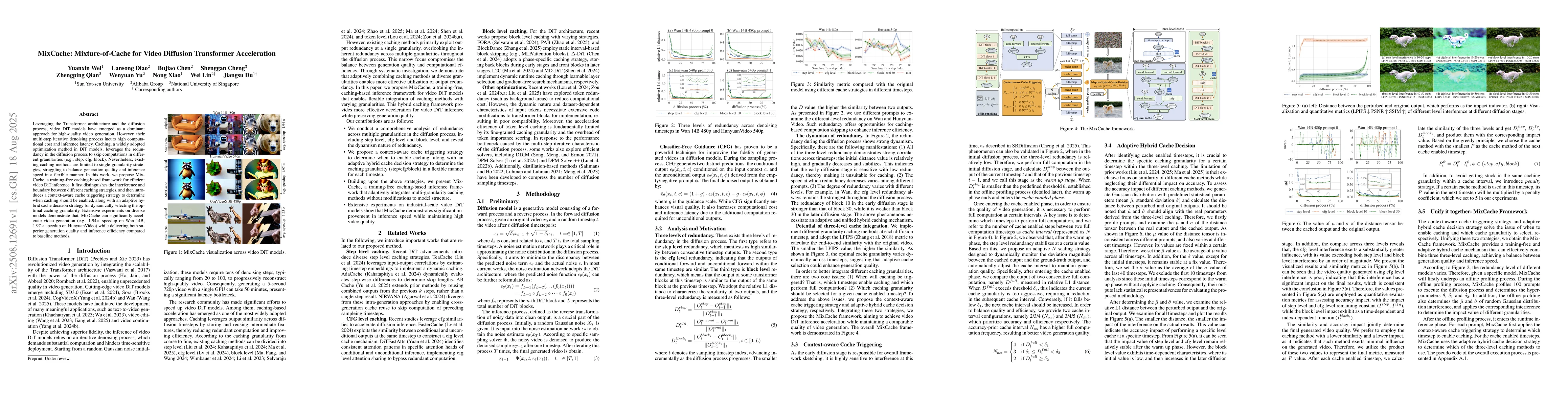 Leveraging the Transformer architecture and the diffusion process, video DiT models have emerged as a dominant approach for high-quality video generation. However, their multi-step iterative denoising process incurs high computational cost and inference latency. Caching, a widely adopted optimization method in DiT models, leverages the redundancy in the diffusion process to skip computations in different granularities (e.g., step, cfg, block). Nevertheless, existing caching methods are limited to single-granularity strategies, struggling to balance generation quality and inference speed in a flexible manner. In this work, we propose MixCache, a training-free caching-based framework for efficient video DiT inference. It first distinguishes the interference and boundary between different caching strategies, and then introduces a context-aware cache triggering strategy to determine when caching should be enabled, along with an adaptive hybrid cache decision strategy for dynamically selecting the optimal caching granularity. Extensive experiments on diverse models demonstrate that, MixCache can significantly accelerate video generation (e.g., 1.94$\times$ speedup on Wan 14B, 1.97$\times$ speedup on HunyuanVideo) while delivering both superior generation quality and inference efficiency compared to baseline methods.