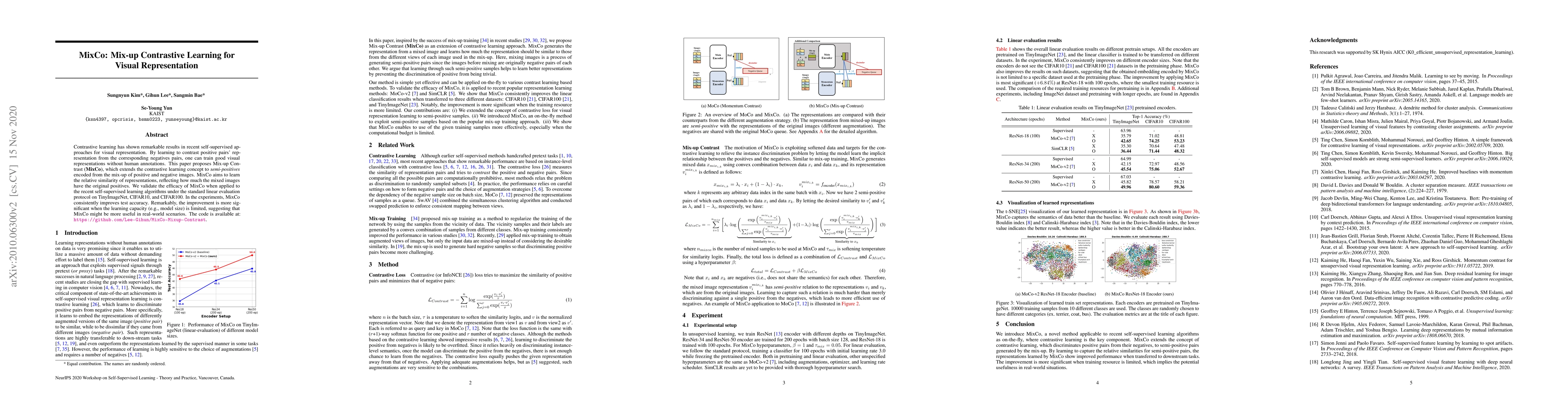 MixCo introduces mix-up contrastive learning to enhance visual representation by contrasting semi-positive pairs derived from mixed positive and negative images, achieving better performance under limited model capacity. Experiments show consistent improvements in test accuracy across CIFAR10, CIFAR100, and TinyImageNet datasets.