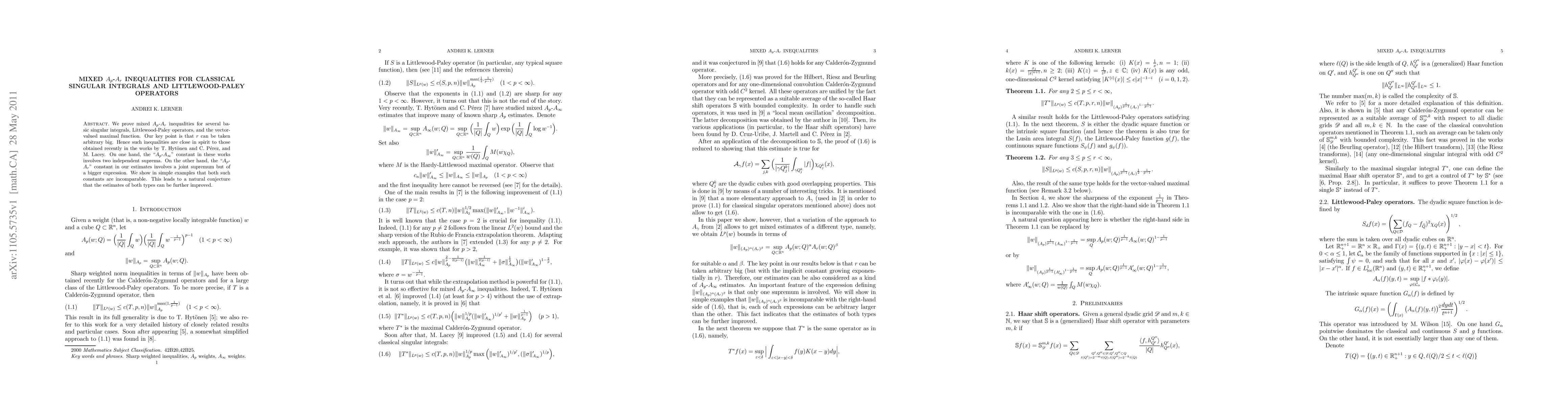 This paper proves mixed $A_p$-$A_r$ inequalities for classical singular integrals, Littlewood-Paley operators, and the vector-valued maximal function, allowing $r$ to be arbitrarily large. The authors conjecture that both types of inequalities can be improved.