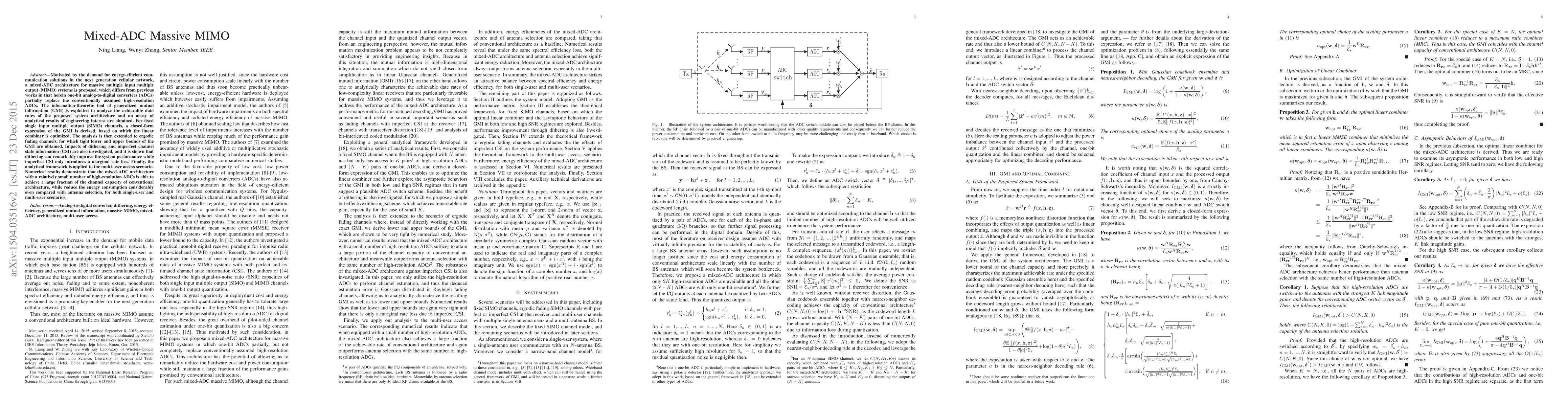 This paper proposes a mixed-ADC architecture for energy-efficient massive MIMO systems, utilizing one-bit ADCs to replace high-resolution ADCs. Analytical results using generalized mutual information show that the proposed system can achieve significant energy savings while maintaining a large fraction of the channel capacity, especially in multi-user scenarios.