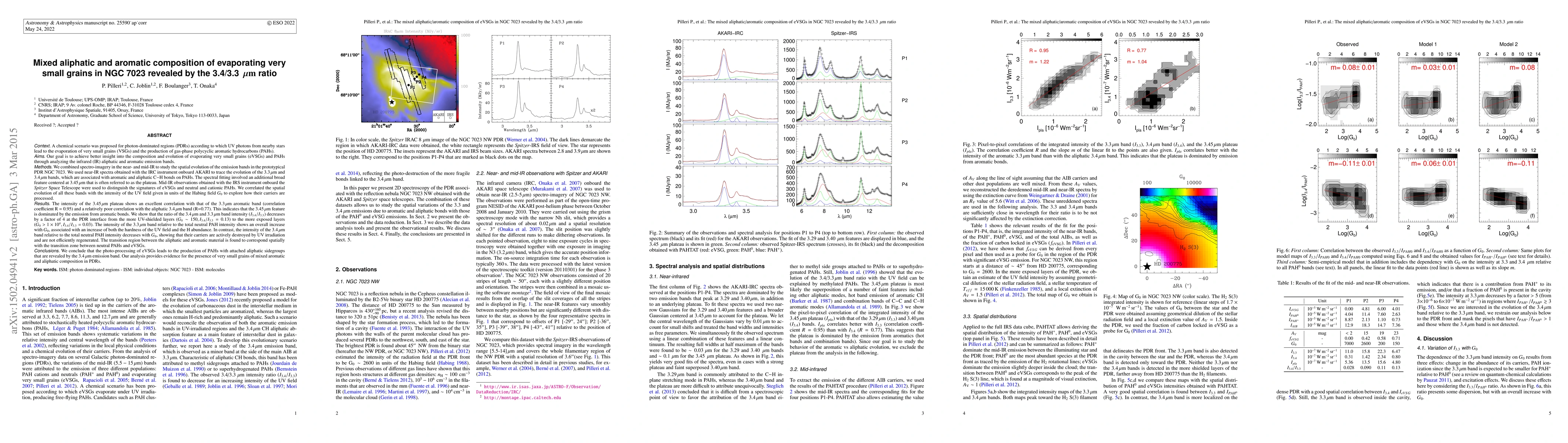 In photon-dominated regions (PDRs), UV photons from nearby stars lead to the evaporation of very small grains (VSGs) and the production of gas-phase polycyclic aromatic hydrocarbons (PAHs). Our goal is to achieve better insight into the composition and evolution of evaporating very small grains (eVSGs) and PAHs through analyzing the infrared (IR) aliphatic and aromatic emission bands. We combined spectro-imagery in the near- and mid-IR to study the spatial evolution of the emission bands in the prototypical PDR NGC 7023. We used near-IR spectra obtained with AKARI to trace the evolution of the 3.3$\mu$m and 3.4$\mu$m bands, which are associated with aromatic and aliphatic C-H bonds on PAHs. The spectral fitting involves an additional broad feature centred at 3.45$\mu$m. Mid-IR observations obtained with Spitzer are used to discriminate the signatures of eVSGs, neutral and cationic PAHs. We correlated the spatial evolution of all these bands with the intensity of the UV field to explore the processing of their carriers. The intensity of the 3.45$\mu$m plateau shows an excellent correlation with that of the 3.3$\mu$m aromatic band (correlation coefficient R = 0.95), indicating that the plateau is dominated by the emission from aromatic bonds. The ratio of the 3.4$\mu$m and 3.3$\mu$m band intensity ($I_{3.4}/I_{3.3}$) decreases by a factor of 4 at the PDR interface from the more UV-shielded to the more exposed layers. The transition region between the aliphatic and aromatic material is found to correspond spatially with the transition zone between neutral PAHs and eVSGs. We conclude that the photo-processing of eVSGs leads to the production of PAHs with attached aliphatic sidegroups that are revealed by the 3.4$\mu$m emission band. Our analysis provides evidence for the presence of very small grains of mixed aromatic and aliphatic composition in PDRs.