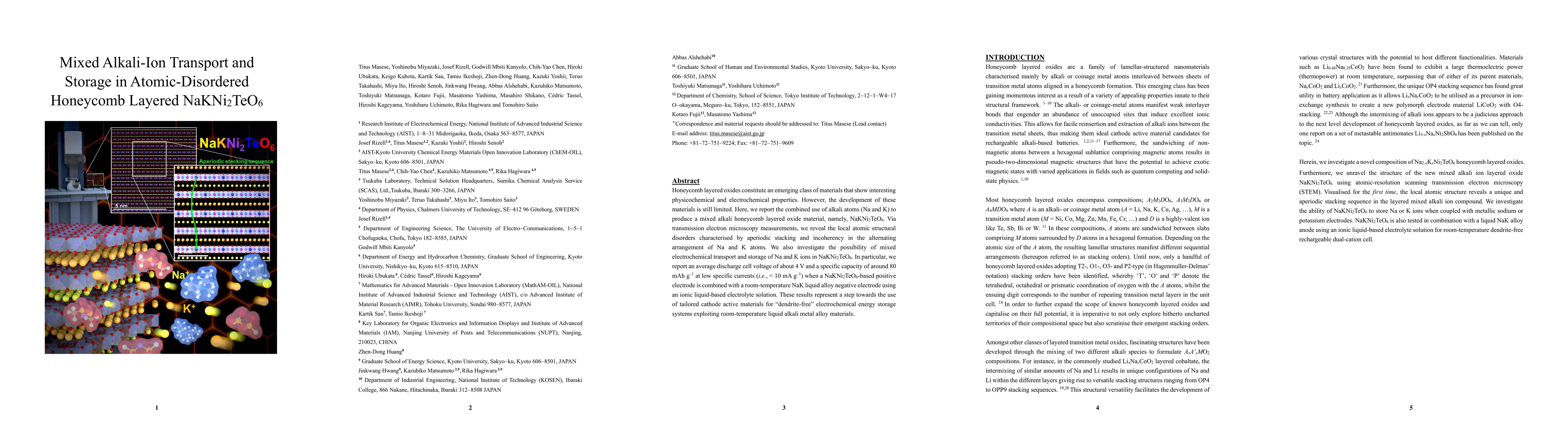This paper reports the synthesis of a mixed alkali honeycomb layered oxide, $\rm NaKNi_2TeO_6$, which exhibits atomic structural disorder due to the alternating arrangement of $\rm Na$ and $\rm K$ atoms. The study investigates its electrochemical properties, achieving an average discharge voltage of $4\, \rm V$ and a specific capacity of $80\, \rm mAh\, g^{-1}$, suggesting potential for dendrite-free energy storage systems.