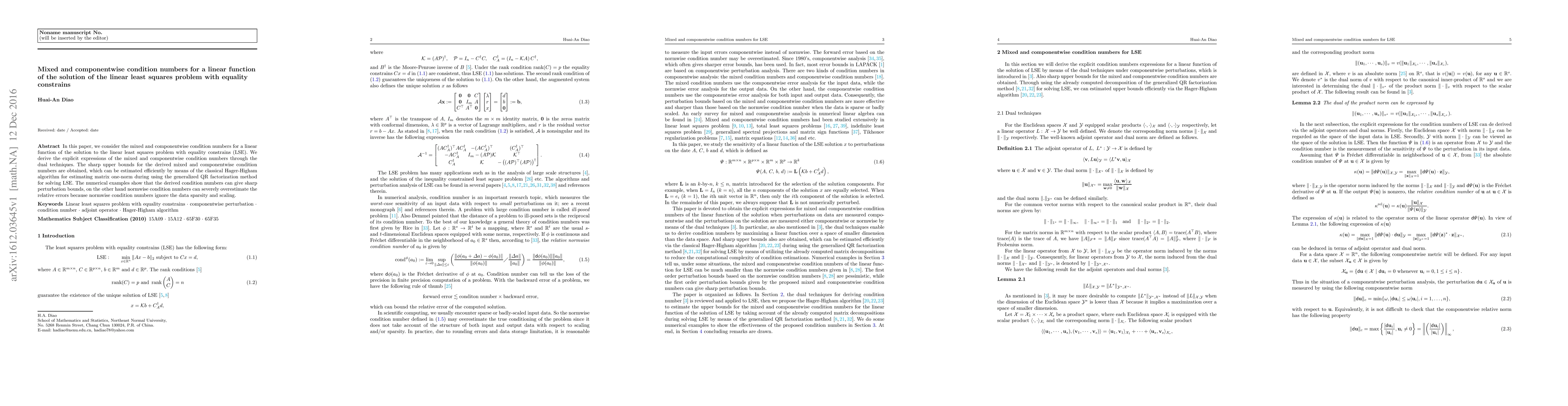 This paper derives explicit expressions for mixed and componentwise condition numbers for a linear function of the solution to the linear least squares problem with equality constraints, using dual techniques and generalized QR factorization. The study provides sharp upper bounds for these conditions, which can be efficiently estimated using the Hager-Higham algorithm, demonstrating that they provide more accurate perturbation bounds compared to normwise condition numbers.