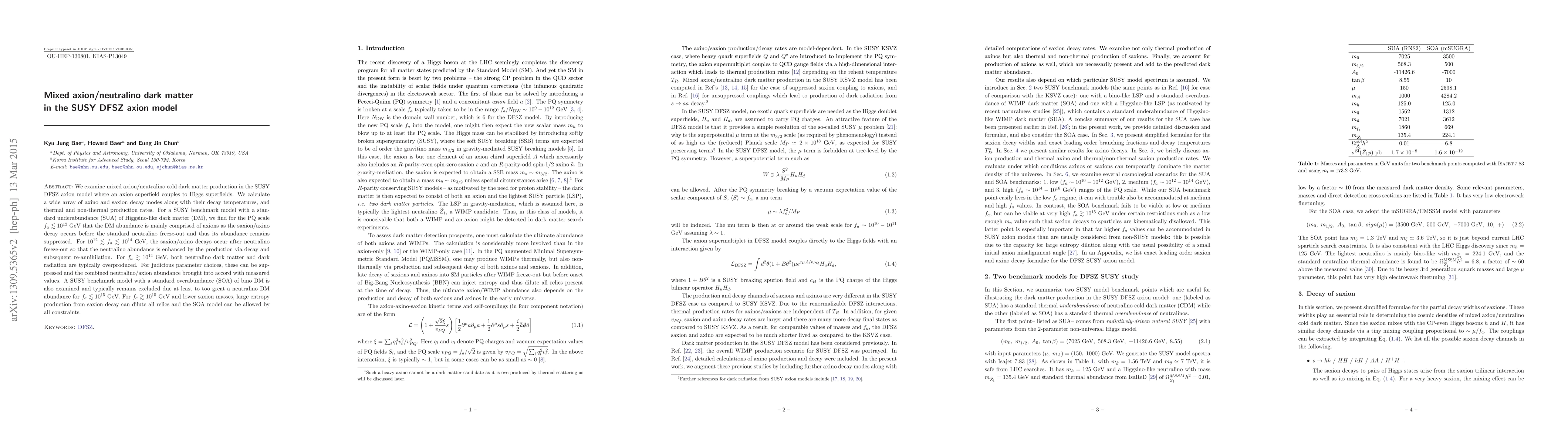 This paper investigates mixed axion/neutralino dark matter in the SUSY DFSZ axion model, finding that the dark matter abundance depends on the Peccei-Quinn scale. For lower scales, axions dominate; higher scales allow neutralinos to be enhanced by saxion/axino decay, though overproduction issues can arise.