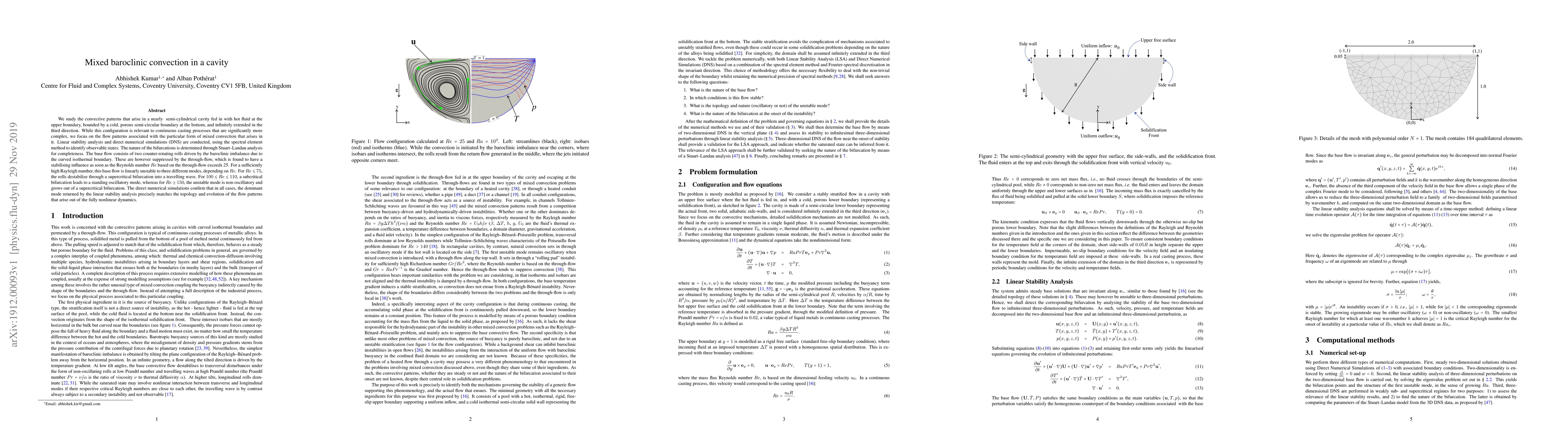 We study the convective patterns that arise in a nearly semi-cylindrical cavity fed in with hot fluid at the upper boundary, bounded by a cold, porous semi-circular boundary at the bottom, and infinitely extended in the third direction. While this configuration is relevant to continuous casting processes that are significantly more complex, we focus on the flow patterns associated with the particular form of mixed convection that arises in it. Linear stability analysis and direct numerical simulations (DNS) are conducted, using the spectral element method to identify observable states. The nature of the bifurcations is determined through Stuart--Landau analysis for completeness. The base flow consists of two counter-rotating rolls driven by the baroclinic imbalance due to the curved isothermal boundary. These are however suppressed by the through-flow, which is found to have a stabilising influence as soon as the Reynolds number $Re$ based on the through-flow exceeds 25. For a sufficiently high Rayleigh number, this base flow is linearly unstable to three different modes, depending on $Re$. For $Re\leq75$, the rolls destabilise through a supercritical bifurcation into a travelling wave. For $100\leq Re \leq 110$, a subcritical bifurcation leads to a standing oscillatory mode, whereas for $Re\geq150$, the unstable mode is non-oscillatory and grows out of a supercritical bifurcation. The direct numerical simulations confirm that in all cases, the dominant mode returned by the linear stability analysis precisely matches the topology and evolution of the flow patterns that arise out of the fully nonlinear dynamics.