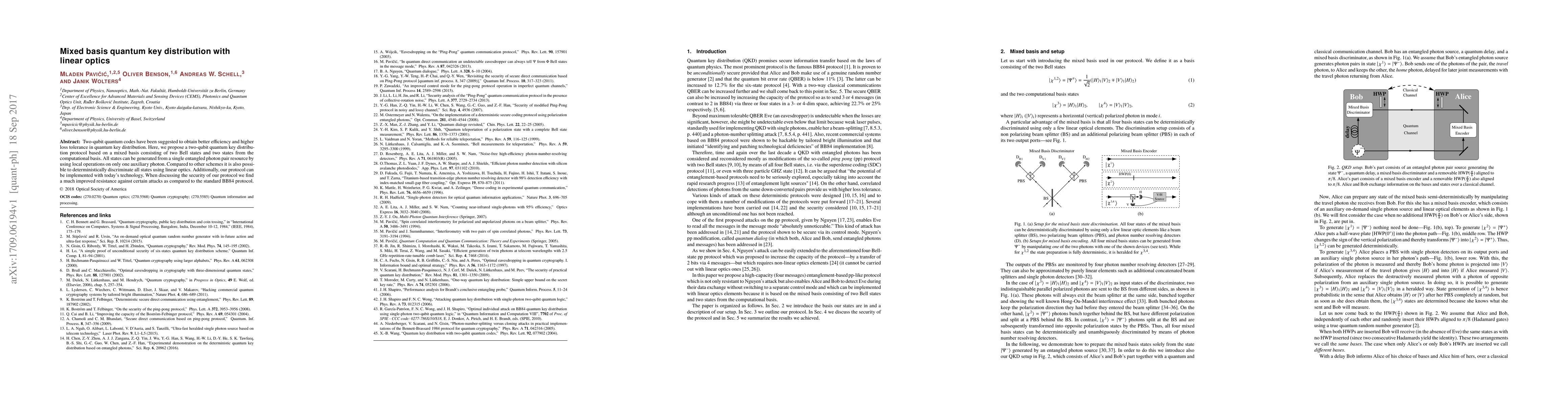 This paper proposes a mixed basis quantum key distribution protocol using two-qubit quantum codes that enhances efficiency and loss tolerance. The protocol utilizes linear optics for state discrimination and can be implemented with current technology, offering improved security against certain attacks compared to the BB84 protocol.