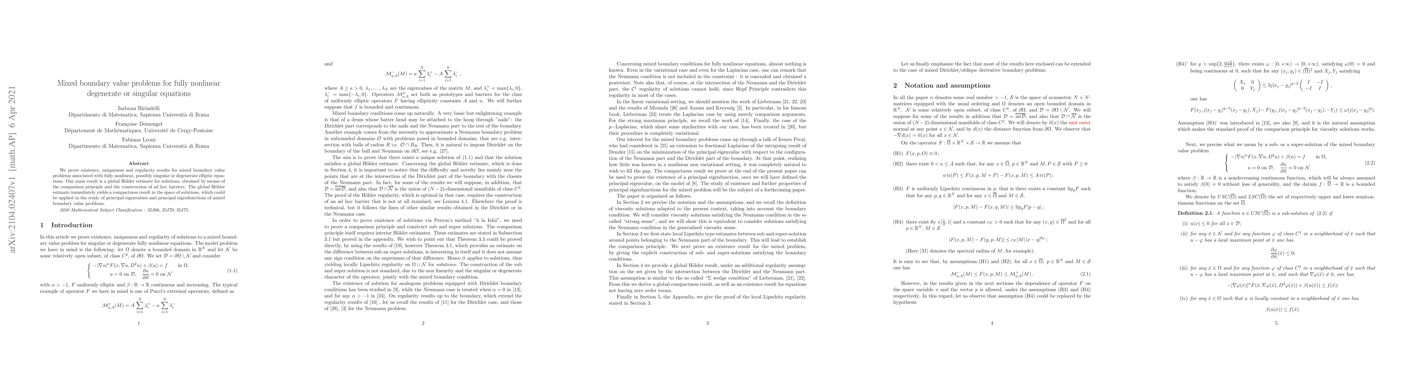 This paper proves existence, uniqueness, and regularity for mixed boundary value problems of fully nonlinear, possibly singular or degenerate elliptic equations, establishing a global H\"older estimate for solutions via comparison principles and ad hoc barriers. The global H\"older estimate also provides a compactness result applicable to studying principal eigenvalues and eigenfunctions.