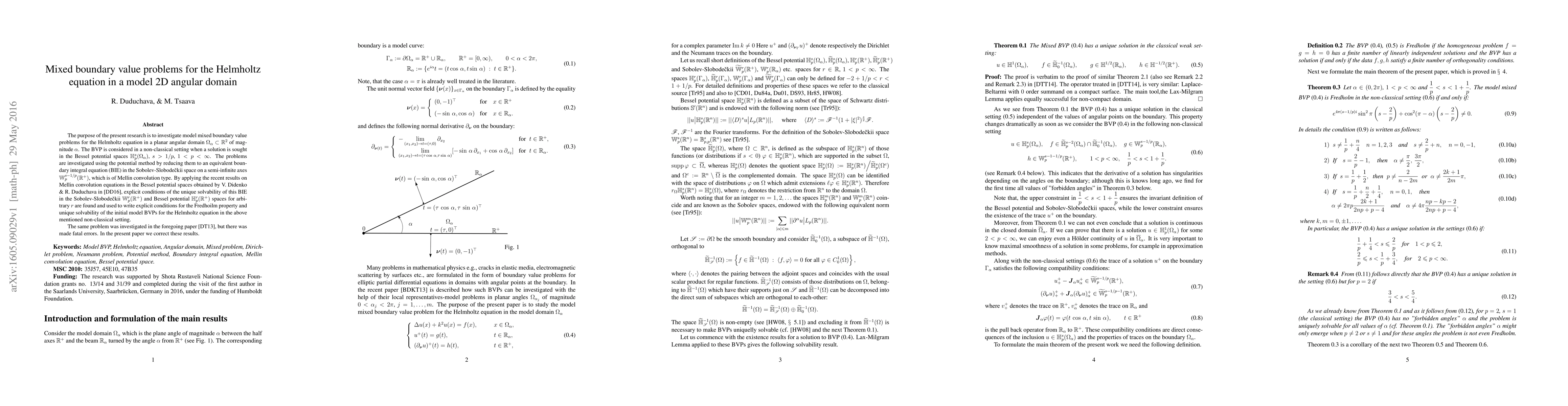 This paper investigates mixed boundary value problems for the Helmholtz equation in a planar angular domain using the potential method, reducing them to a Mellin convolution type boundary integral equation. It corrects previous errors and provides explicit conditions for the unique solvability and Fredholm property in non-classical Bessel potential spaces.