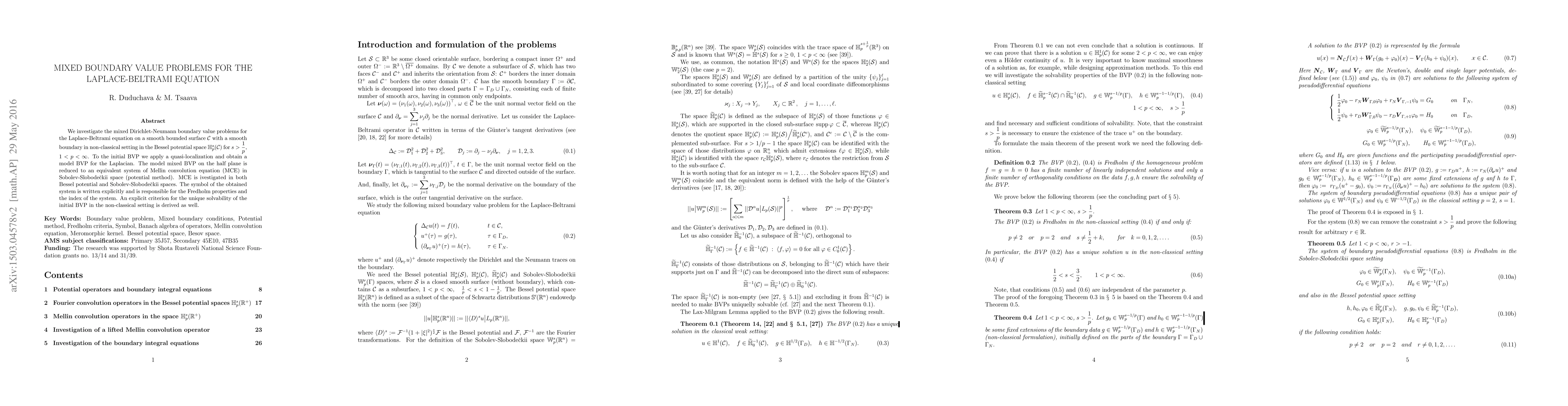 This paper explores mixed boundary value problems for the Laplace-Beltrami equation on smooth hypersurfaces, employing quasilocalization to derive model problems and using potential methods to solve them via Mellin convolution equations in Bessel potential and Besov spaces, establishing Fredholm properties and unique solvability criteria.