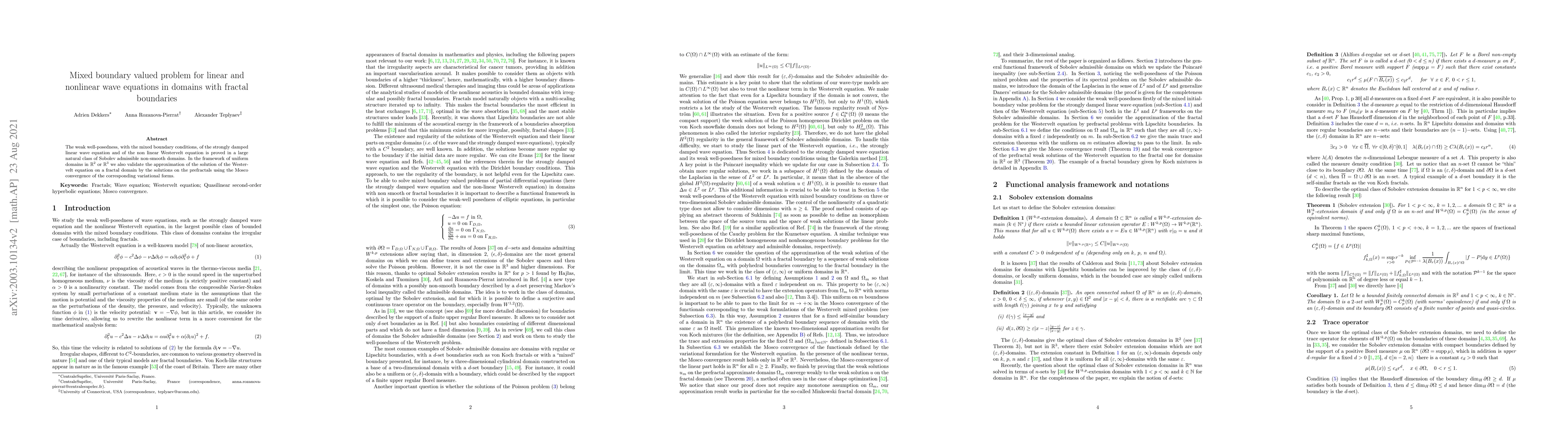 The weak well-posedness, with the mixed boundary conditions, of the strongly damped linear wave equation and of the non linear Westervelt equation is proved in the largest natural class of Sobolev admissible non-smooth domains. In the framework of uniform domains in R^2 or R^3 we also validate the approximation of the solution of the Wester-velt equation on a fractal domain by the solutions on the prefractals using the Mosco convergence of the corresponding variational forms.