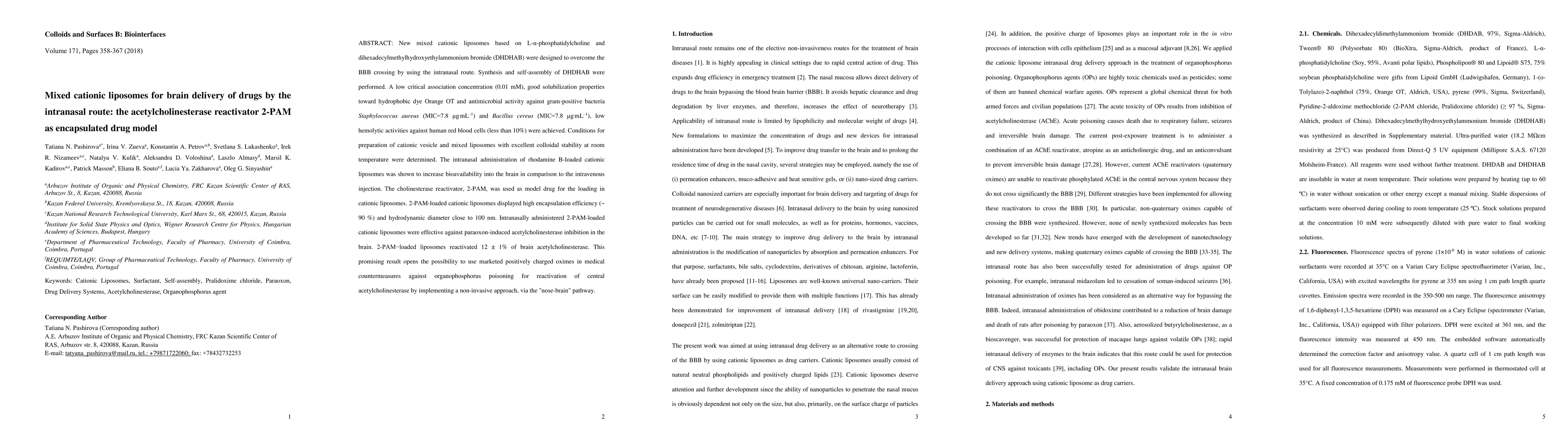 New mixed cationic liposomes based on L-{\alpha}-phosphatidylcholine and dihexadecylmethylhydroxyethylammonium bromide (DHDHAB) were designed to overcome the BBB crossing by using the intranasal route. Synthesis and self-assembly of DHDHAB were performed. A low critical association concentration (0.01 mM), good solubilization properties toward hydrophobic dye Orange OT and antimicrobial activity against gram-positive bacteria Staphylococcus aureus (MIC=7.8 {\mu}g.mL-1) and Bacillus cereus (MIC=7.8 {\mu}g.mL-1), low hemolytic activities against human red blood cells (less than 10%) were achieved. Conditions for preparation of cationic vesicle and mixed liposomes with excellent colloidal stability at room temperature were determined. The intranasal administration of rhodamine B-loaded cationic liposomes was shown to increase bioavailability into the brain in comparison to the intravenous injection. The cholinesterase reactivator, 2-PAM, was used as model drug for the loading in cationic liposomes. 2-PAM-loaded cationic liposomes displayed high encapsulation efficiency (~ 90 %) and hydrodynamic diameter close to 100 nm. Intranasally administered 2-PAM-loaded cationic liposomes were effective against paraoxon-induced acetylcholinesterase inhibition in the brain. 2-PAM-loaded liposomes reactivated 12 +/- 1% of brain acetylcholinesterase. This promising result opens the possibility to use marketed positively charged oximes in medical countermeasures against organophosphorus poisoning for reactivation of central acetylcholinesterase by implementing a non-invasive approach, via the "nose-brain" pathway.