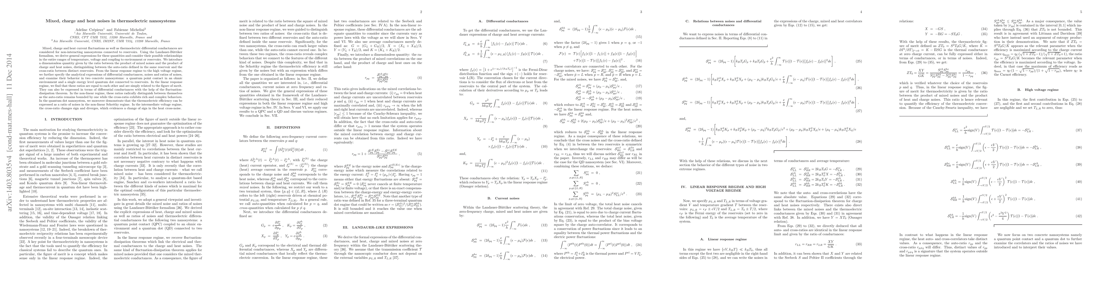 This paper investigates mixed, charge, and heat noise fluctuations in thermoelectric nanosystems using the Landauer-Büttiker formalism. It derives expressions for these quantities and examines their relationships across various regimes, highlighting distinct behaviors in linear and non-linear response, and demonstrating thermoelectric efficiency in quantum dot nanosystems.